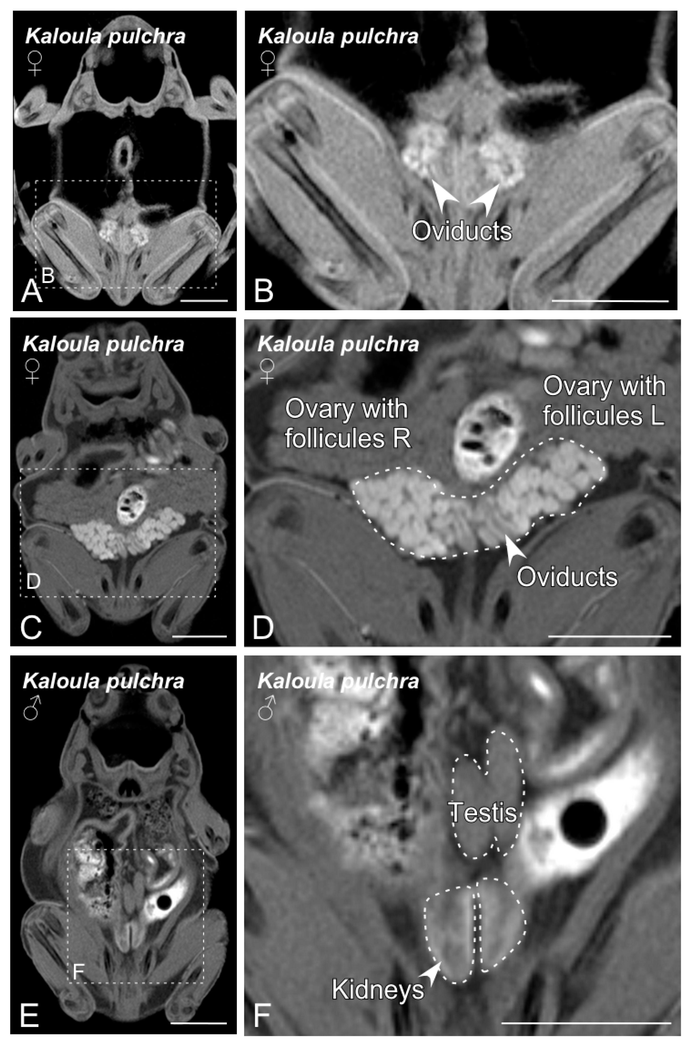Figure 2. Magnetic resonance imaging (MRI) slices selected to classify Kaloula pulchra anurans by sex. Images from (A) to (D) show the main sexual structures identified in a non-gravid (A,B) and gravid (C,D) Kaloula pulchra female. Images (E) and (F) show testis and kidneys in a Kaloula pulchra male. The dashed lines in (A,C,E) indicate the magnification photos showed in (B,D,F). Scale bars = 1 cm. |