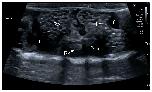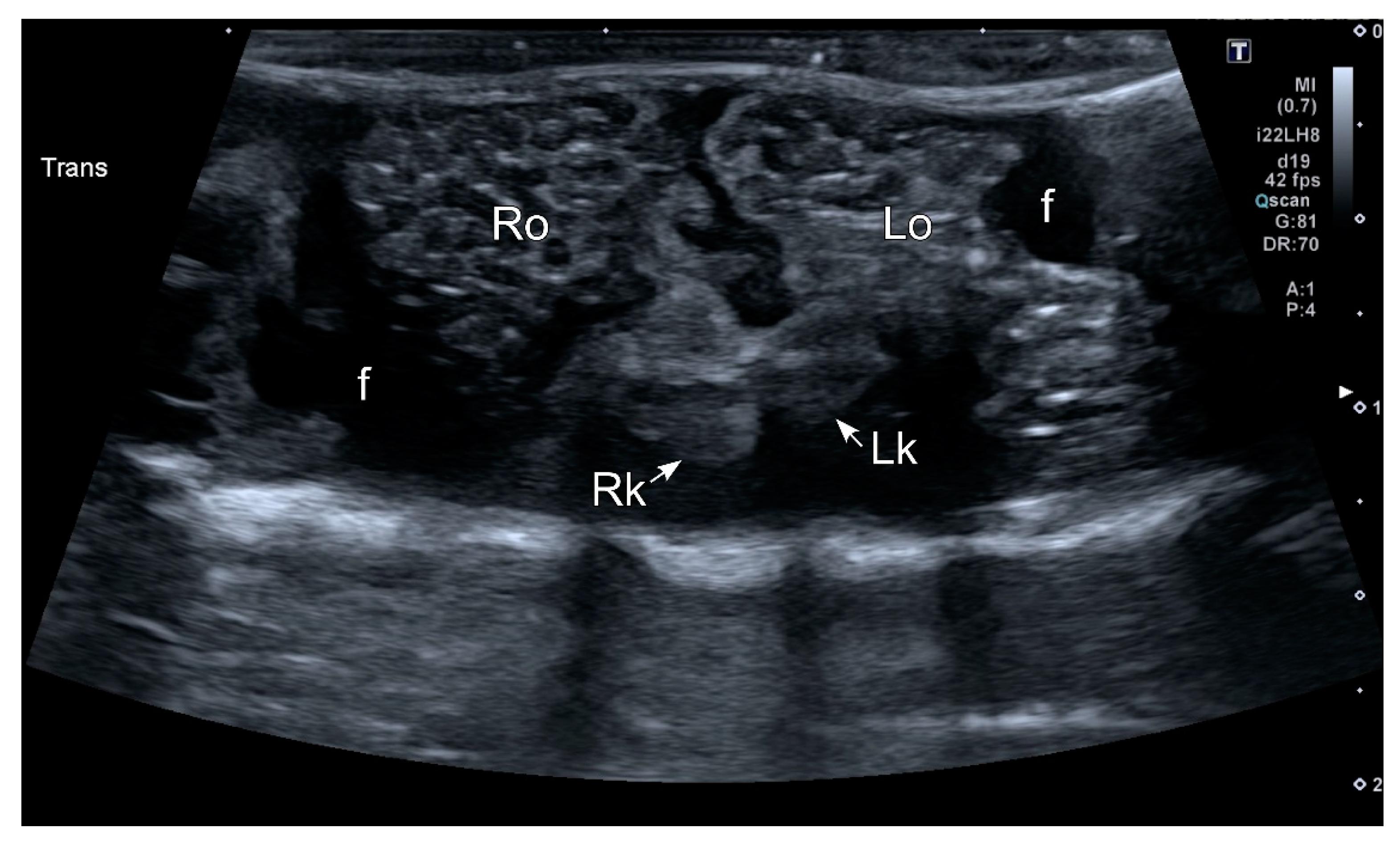 Figure 6. HR-US image of a female Kaloula pulchra obtained in the transverse plane using a ventral acoustic window. The image was taken just after oviposition. Both ovaries (right ovary: Ro; left ovary: Lo) appeared as hyperechoic structures with multiple hypoechoic foci which represent follicles. The kidneys are also visible (right kidney: Rk; left kidney: Lk). This animal had free fluid (f), which is considered normal in amphibians. The fluid around the ovaries improves its margin definition. |