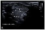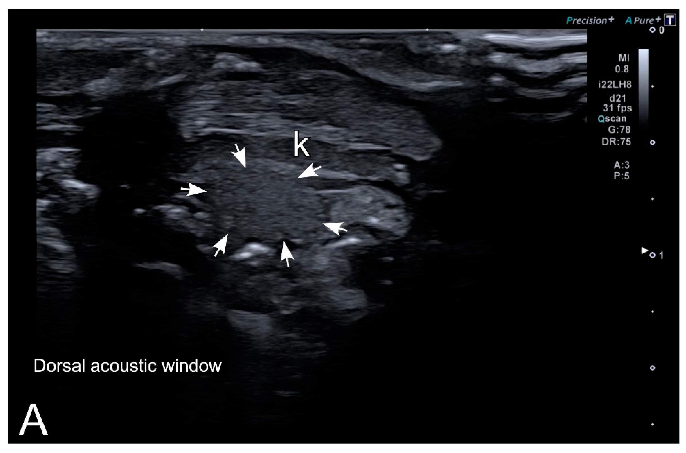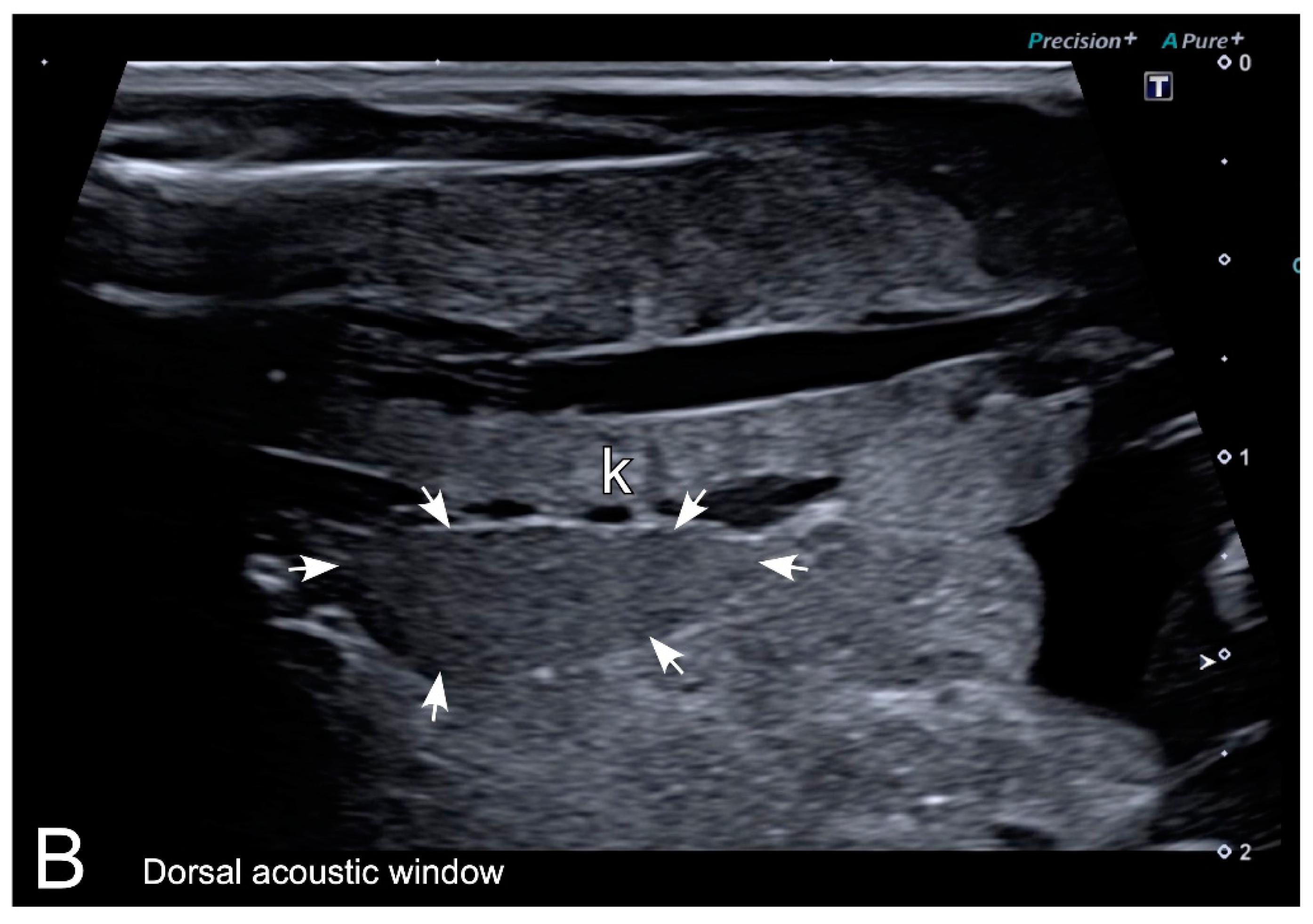 Figure 7. Representative HR-US images of Kaloula pulchra (A) and Xenopus laevis (B) males obtained in the longitudinal plane using a dorsal acoustic window. The testes (delimited by arrows) appeared as structures with oval morphology, mid echogenicity and homogenous echotexture. Testes were located just ventral or ventrolateral of the ipsilateral kidney (k). |