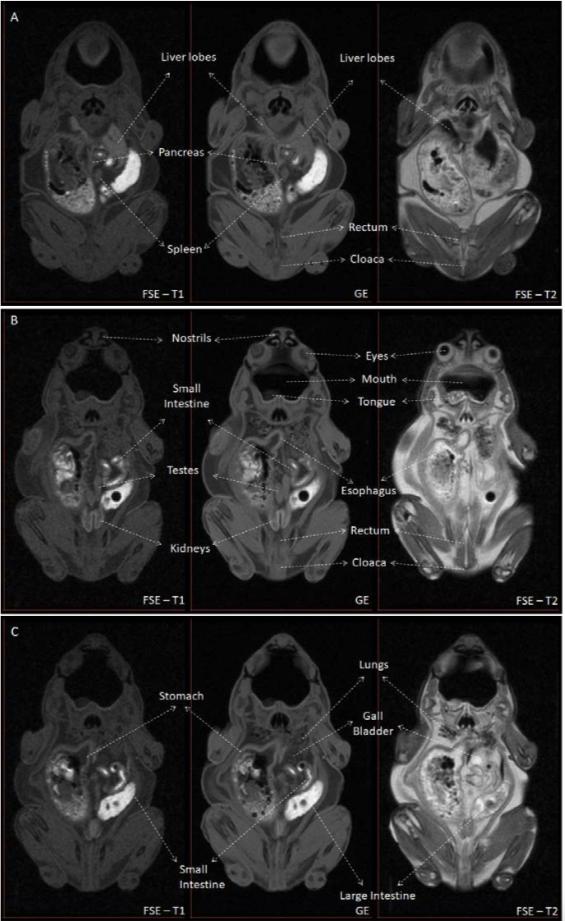 Figure S1 - MRI identification of structures contained in the coelomic cavity. Figure S1 shows the main structures identified in the coelomic cavity in Kaloula pluchra frog. Three different slices of the MRI experiment were selected (A, B, C). Three different MRI weightings (Fast Spin Echo T1-weighted, Gradient Echo and FSE T2-weighted) are shown for each slice. |