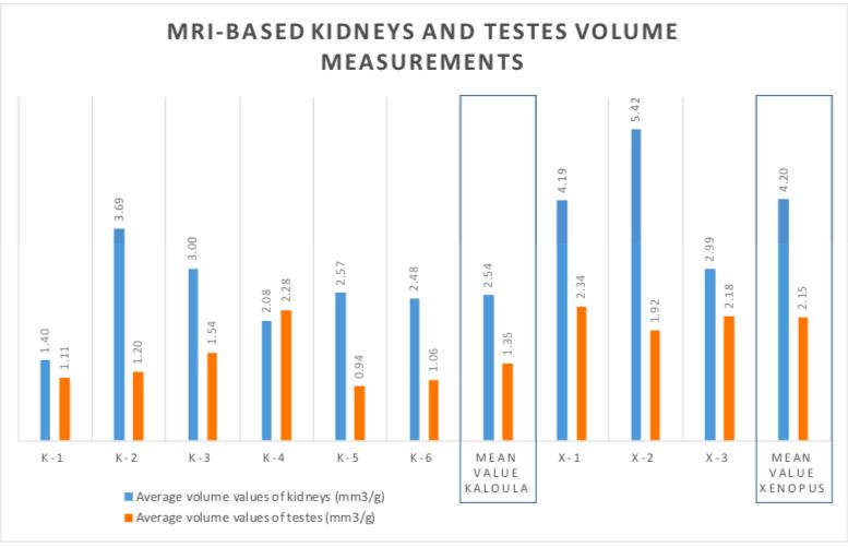 Graph S1. MRI - Volumetric quantification of testes and kidneys. Graph S1 shows the average volume values weighted by body mass (mm3/g) of kidneys and testes measured in six Kaloula pulchra (K-1 to K-6) and three Xenopus laevis anurans (X-1 to X-3). The graph is intended to show the possibility of obtaining quantitative information through the MRI study. This fact allows to contribute to the phenotyping between different species. As shown in the graph, regardless of the amphibian weight, the mean values for body-mass-weighted volume of kidneys and testis were considerably higher in Xenopus laevis anurans. |