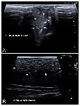 Figure 4. Representative high-resolution ultrasound (HR-US) images of a female Kaloula pulchra obtained in the transverse plane (A) and a female Xenopus laevis (B) obtained in the longitudinal plane using, in both cases, a ventral acoustic window. Follicles appeared as a complex of anechoic or hypoechoic rounded or oval areas separated by hyperechoic lines. |