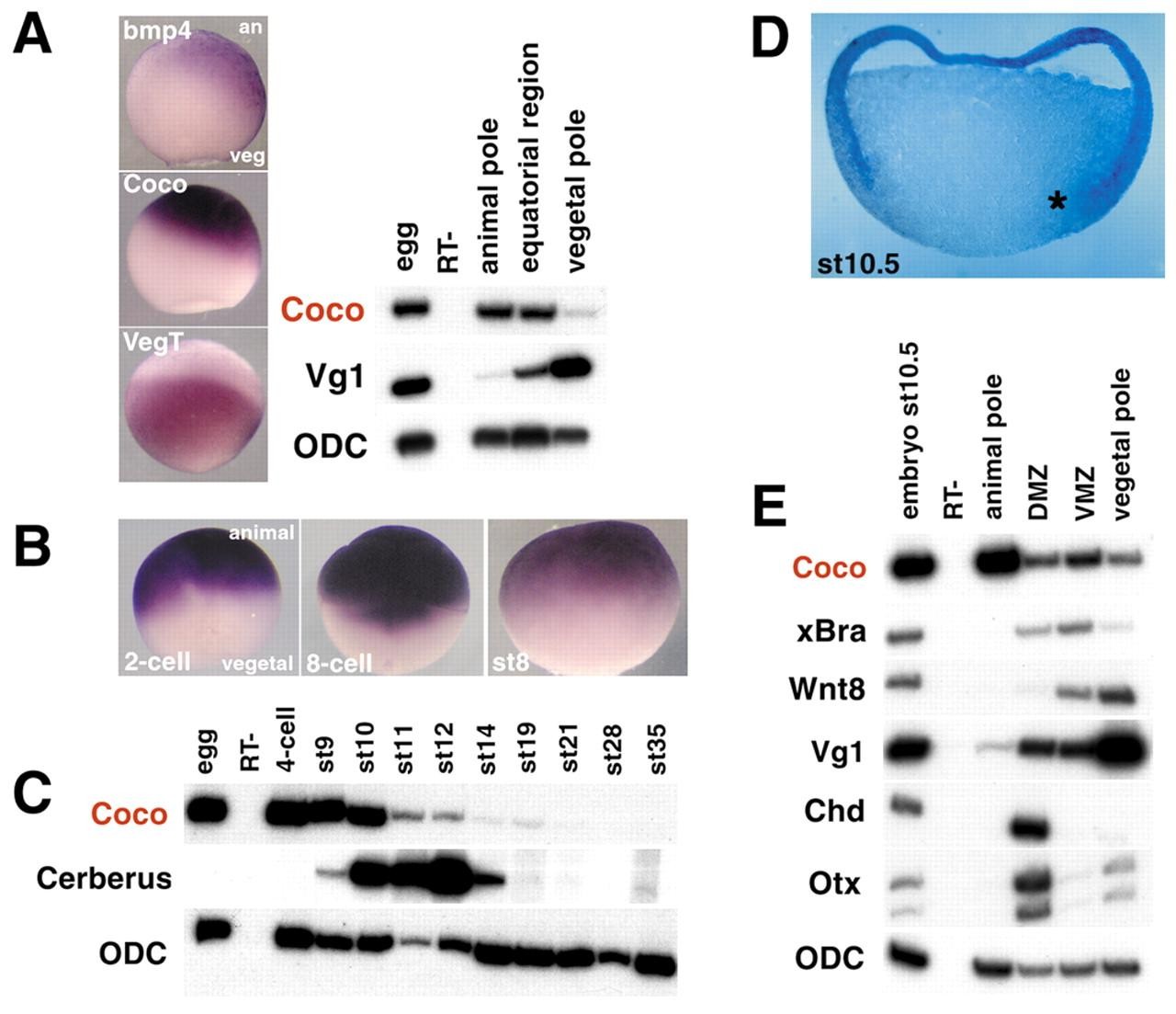 Patterning of the pre-gastrula embryo and subsequent neural induction post-gastrulation are very complex and intricate processes of which little, until recently, has been understood. The earliest decision in neural development, the choice between epidermal or neural fates, is regulated by bone morphogenetic protein (BMP) signaling within the ectoderm. Inhibition of BMP signaling is sufficient for neural induction. Many secreted BMP inhibitors are expressed exclusively within the organizer of the Xenopus gastrula embryo and therefore are predicted to act as bona fide endogenous neural inducers. Other cell-autonomous inhibitors of the BMP pathway are more widely expressed, such as the inhibitory Smads, Smad6 and Smad7. In this report we describe the biological and biochemical characterization of 51-B6, a novel member of Cerberus/Dan family of secreted BMP inhibitors, which we identified in a screen for Smad7-induced genes. This gene is expressed maternally in an animal to vegetal gradient, and its expression levels decline rapidly following gastrulation. In contrast to known BMP inhibitors, 51-B6 is broadly expressed in the ectoderm until the end of gastrulation. The timing, pattern of expression, and activities of this gene makes it unique when compared to other BMP/TGFbeta/Wnt secreted inhibitors which are expressed only zygotically and maintained post-gastrulation. We propose that a function of 51-B6 is to block BMP and TGFbeta signals in the ectoderm in order to regulate cell fate specification and competence prior to the onset of neural induction. In addition, we demonstrate that 51-B6 can act as a neural inducer and induce ectopic head-like structures in neurula staged embryos. Because of this embryological activity, we have renamed this clone Coco, after the Spanish word meaning head.