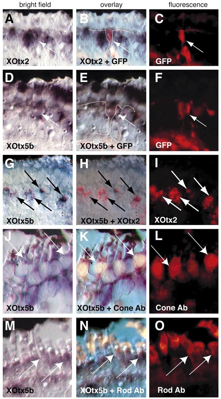 Fig. 3. Identification of cells expressing XOtx2 and XOtx5b. XOtx2 is expressed in bipolar cells. (A) Sagittal section of a stage 41 GFP-lipofected embryo hybridised with a DIG-labelled XOtx2 anti-sense RNA probe. The arrow points to a cell in the INL stained with XOtx2. (C) Under fluorescence, the same section as in A, stained with a GFP antibody, reveals that the XOtx2-positive cell is a bipolar cell. (B) Superimposition of the image in A onto that in C. The arrow points to the same cell in all three panels. XOtx5b is also expressed in bipolar cells. (D-F) The same result is found in a retina stained for XOtx5b. (D) Sagittal section of a stage 41 GFP-lipofected embryo hybridised with a DIG-labelled XOtx5b anti-sense RNA probe. The arrow points to the same cell in F, which is a bipolar cell. (E) The overlay shows that the same cell is labelled for both XOtx5b and GFP. Cells in the INL that express XOtx5b also express XOtx2. (G-I) Stage 41 GFP-lipofected embryo section labelled with DIG-labelled XOtx5b (G: blue) and fluorescein-labelled XOtx2 (I: red) anti-sense RNA probes. The arrows point to the same cells in all three panels, which are positive for both the XOtx5b and XOtx2 probes, as shown in the overlay (H). (J-O) XOtx5b is also expressed by both rod and cone photoreceptors. In situ hybridisation of XOtx5b (blue) onto stage 41 sagittal sections co-stained for calbindin antibody (J-L) or rod opsin antibody (M-O). (J) Cells expressing XOtx5b also produce calbindin protein (L). The overlay (K) shows that these are the same cells, demonstrating that they are cone photoreceptor cells. (M) Similarly, XOtx5b is found in cells that generate rhodopsin (O). Thus, rod photoreceptors also express XOtx5b. (K,N) Merging panels J with L (K) and M with O (N) confirms this. Cryostat sections cut to 10 μm. |