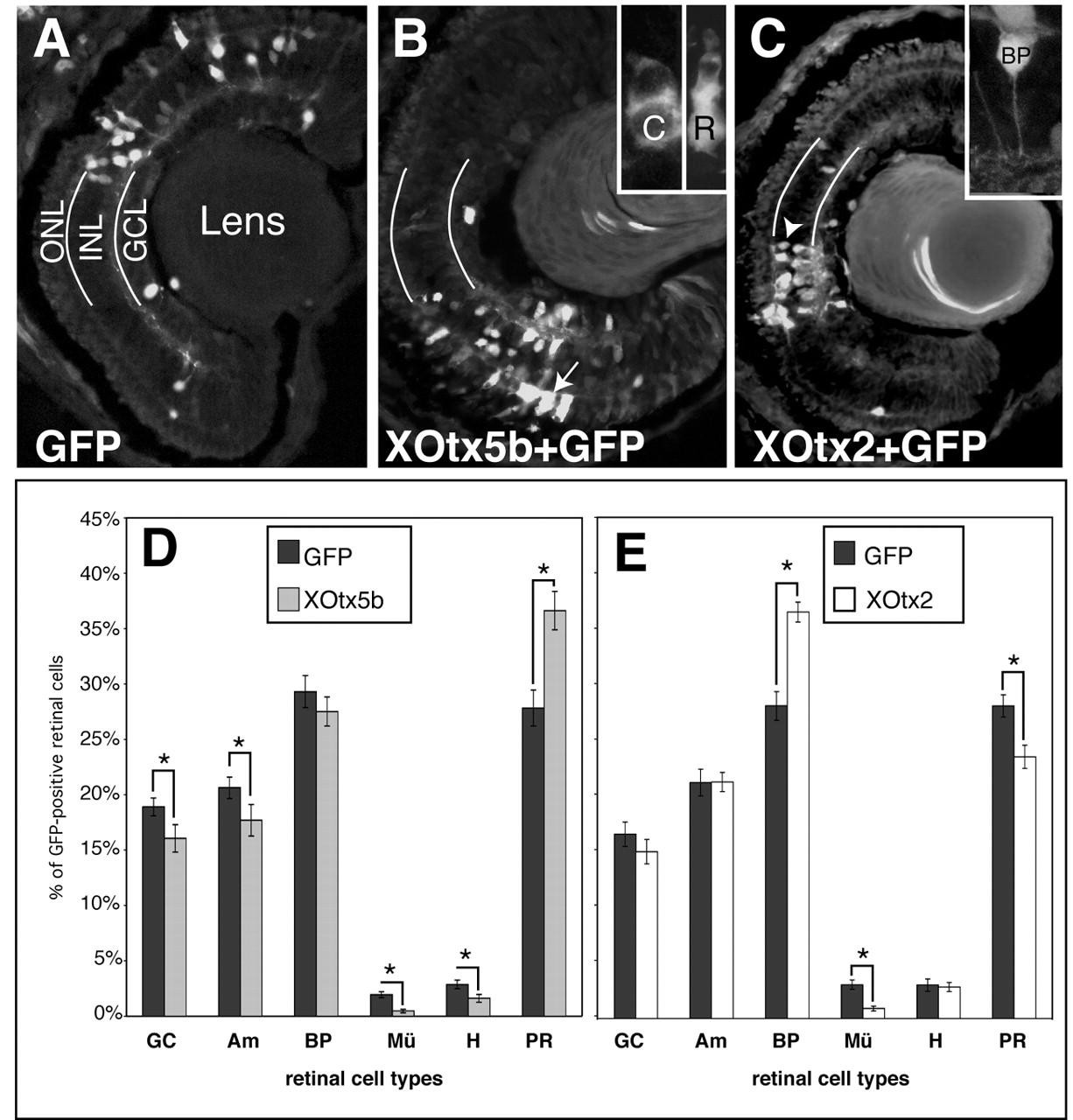 Fig. 4. Overexpression of XOtx5b or XOtx2 in developing Xenopus retinoblasts causes an increase in photoreceptors or bipolars, respectively. (A) Co-lipofection of GFP and the pCS2+ vector in the Xenopus retina. A diversity of retinal cell types express the fluorescent marker. White lines are drawn over the inner and outer plexiform layers to better define the outer nuclear layer (ONL), inner nuclear layer (INL) and the ganglion cell layer (GCL). (B) Retina co-lipofected with XOtx5b and GFP shows an increase in lipofected photoreceptor cells (arrow). The insets show a close-up of a cone (C) and a rod (R) photoreceptor cell. (C) Retina co-lipofected with XOtx2 and GFP shows an increase in the number of lipofected bipolar cells (arrowhead). (Inset) Confocal image of a representative bipolar cell (BP). (D,E) Each of the retinal cell types (GC, ganglion cells; Am, amacrine cells; BP, bipolar cells; Mü, Müller cells; H, horizontal cells; PR, photoreceptor cells) was counted per retina (n) and the percentage for each was determined. The graphs show an average of the percentages obtained. (D) GFP + pCS2+ (n=45) and XOtx5b + GFP (n=32) lipofected retinas. (E) GFP + pCS2+ (n=20) and XOtx2 + GFP (n=20) lipofected retinas. The error bars represent the s.e.m. The asterisks indicate significant difference by a Student's t-test between the ratios found for the control versus the experimental for that particular cell type with Pâ¤0.003. |