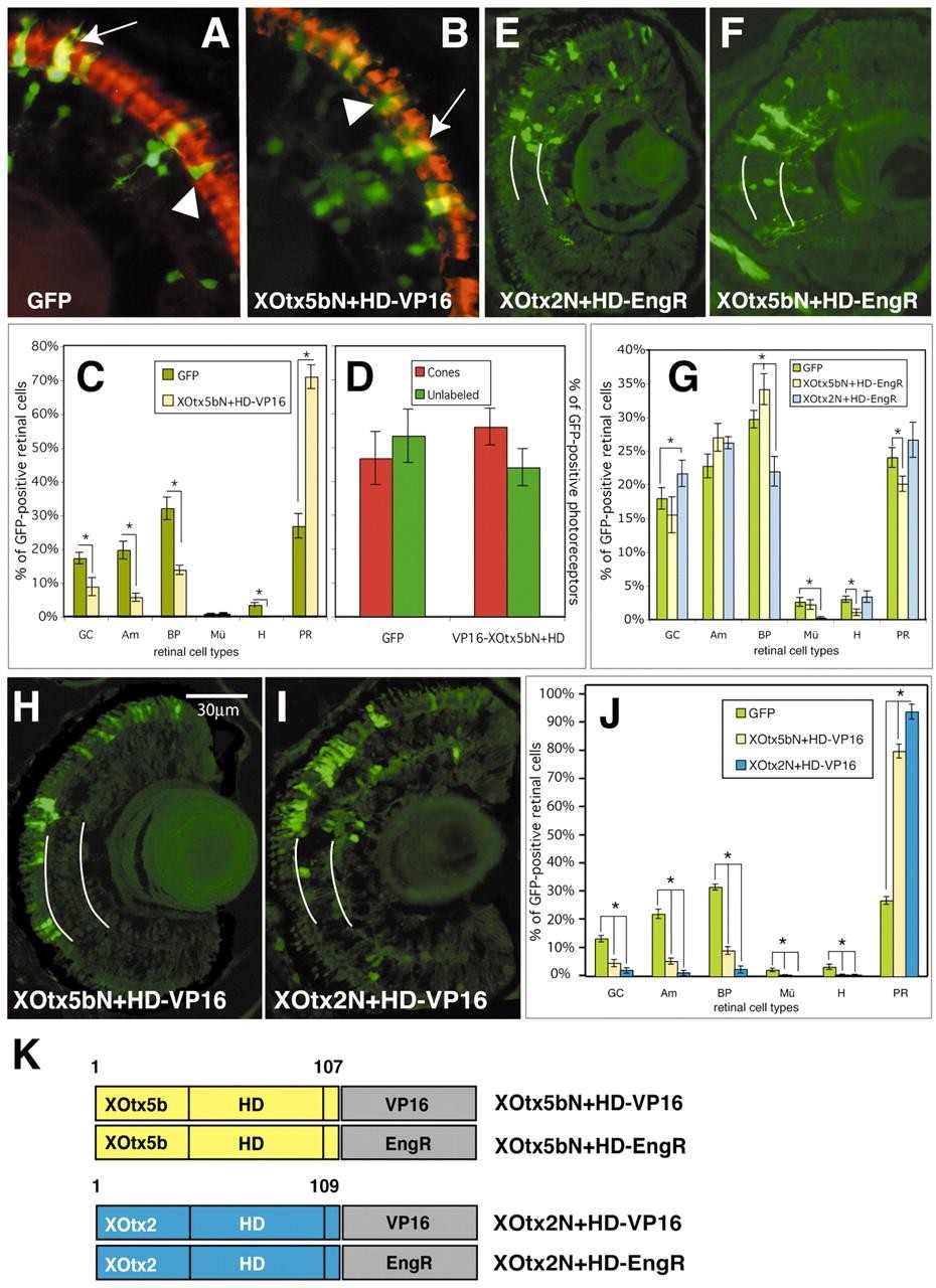 Fig. 5. Effects of VP16 or Engrailed fusion constructs of XOtx5b and XOtx2 on retinal cell fate decisions. (A,B) Cryostat sections (10 μ m) of retinas lipofected with (A) GFP and the pCS2+ vector or (B) XOtx5bN+HD-VP16 and GFP then stained with an anti-cone photoreceptor antibody (calbindin in red). Arrowheads indicate cells that fluoresce with GFP alone (green) and arrows indicate cells expressing both GFP and calbindin (yellow). (C) Graph showing an increase in the distribution of GFP-positive photoreceptor cells in retinas colipofected with XOtx5bN+HD-VP16 and GFP (n=344) when compared to GFP and pCS2+ (n=493). Values were calculated as in Fig. 4D,E; Pâ¤0.04. In C,D,G and J asterisks indicate P values as calculated using a Student's t-test; n=the total number of retinal cells counted; error bars, s.e.m. (D) Graph showing the types of photoreceptor cells produced in retinas co-lipofected with GFP and pCS2+ (n=184) or VP16-XOtx5bHD and GFP (n=267). Cells positive for GFP (unlabelled) or GFP and calbindin (cones) were counted in one retina and the percentage of each determined. Percentages from both cones and unlabeled cells were averaged in all retinas counted. The error bar indicates s.e.m. Even though a larger number of photoreceptors were produced in XOtx5bN+HD-VP16 lipofected retinas (C), cones and unlabeled cell numbers were similar to each other in retinas lipofected with either XOtx5bN+HD-VP16 or the control construct. (E) Cryostat section (10 μ m) of a retina co-lipofected with GFP and XOtx2N+HD-EngR, which shows a decreased number of bipolar cells. White lines (also in F-H) mark the inner and outer plexiform layers. (F) GFP and XOtx5bN+HD-EngR co-lipofected retina (10 μm cryostat section) showing a distinct decrease of fluorescently labelled photoreceptor cells. (G) The percentage of GFP-positive photoreceptor cells in the XOtx5bN+HD-EngR+GFP (n=651) co-lipofected retinas is decreased while the percentage of GFP-positive bipolar cells is decreased in the XOtx2N+HD-EngR+GFP (n=474) co-lipofected retinas when compared to controls (GFP and pCS2+, n=692). This is a representative experiment. Lipofection of each construct with the control was repeated in two separate experiments, resulting in identical population shifts as shown [XOtx2N+HD-EngR+GFP (n=1692); XOtx5bN+HD-EngR+GFP (n=2121)]. Pâ¤0.05, (H-I) Sagittal section of stage 41 retinas that have been co-lipofected with GFP and either (H) XOtx5bN+HD-VP16 or (I) XOtx2N+HD-VP16. In both, there are a large number of labelled photoreceptor cells. Scale bar: 30 μm. (J) The percentage of each retinal cell type, which is GFP-positive, in retinas lipofected with XOtx5bN+HD-VP16 (n=342) or XOtx2N+HD-VP16 (n=294) and GFP. GFP and the expression vector alone acted as the control (n=535). Nearly all of the GFP-positive cells are photoreceptors in the experimental lipofected retinas. The asterisk denotes significant differences between the control and each of the constructs lipofected (Pâ¤0.02); GC, ganglion cells; Am, amacrine cells; BP, bipolar cells; Mü, Müller cells; H, horizontal cells; PR, photoreceptor cells. (K) A schematic of the constructs used in the above lipofections. HD, homeodomain. The numbers above the bars indicate the amino acid residues. |