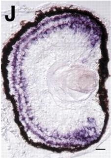 Fig. 2. Expression of XOtx5b and XOtx2 in retinal sections. Section in situ hybridisation of XOtx2 (A-E) and XOtx5b (F-J) in the Xenopus retina at stages 25/26 (A,F), 28 (B,G), 33 (C,H), 37 (D,I) and 41 (E,J). (A,F) XOtx2 (A) is expressed throughout the presumptive retinal pigment epithelium and retina while XOtx5b (F) expression is only in the central retina. (B,G) As retinal invagination progresses, expression of both XOtx2 (B) and XOtx5b (G) appear in the central retina. (C,H) Expression of XOtx2 (C) and XOtx5b (H) is identical. Transcripts from either of these genes are found throughout the developing retina except in the peripheral dorsal and ventral regions. (D,I) The central retinal expression of these two transcripts is reduced to particular layers. XOtx2 (D) is expressed in the outer edge of the inner nuclear layer (INL). XOtx5b (I) is also found in the outer edge of the INL and also in the outer nuclear layer (ONL). The peripheral retina still expresses these transcripts in the ganglion cell layer. (E,J) When the retina is mature, XOtx5b (J) is found in both the photoreceptor layer and the outer cells of the INL. Like XOtx2 (E), it is also found in the edge of the CMZ. XOtx2 is also expressed in cells at the outer edge of the INL. Bars: 20 μm; dashed lines indicate the extent of developing neural retina in A-D,F-I. |