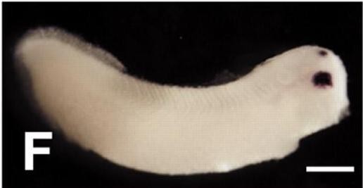 Fig. 1. Localization of XOtx2 and XOtx5b in the developing Xenopus embryo. Whole-mount in situ hybridisation of embryos at stage 20 (A,D), stage 25 (B,E) and stage 31 (C,F) were probed with full-length cDNA of XOtx2 (A-C) and the 3Ⲡuntranslated region of XOtx5b (D-F). (A) Before eye vesicle formation but after evagination, XOtx2 is expressed in both presumptive eye and anterior neural tube. (D) At this same stage, XOtx5b is found in the epiphysis (arrow) and cement gland but is distinctly absent from the eye field. (B) XOtx2 expression continues in the presumptive eye and forebrain (arrow). (E) Expression of XOtx5b just begins in a few cells of the eye and remains in the presumptive pineal (arrow) while cement gland expression recedes. (C) In a subsequent stage, XOtx2 expression becomes more pronounced in both the eye and the forebrain. (F) XOtx5b is found throughout the eye and in the singular pineal. Bars indicate 500 μm. |