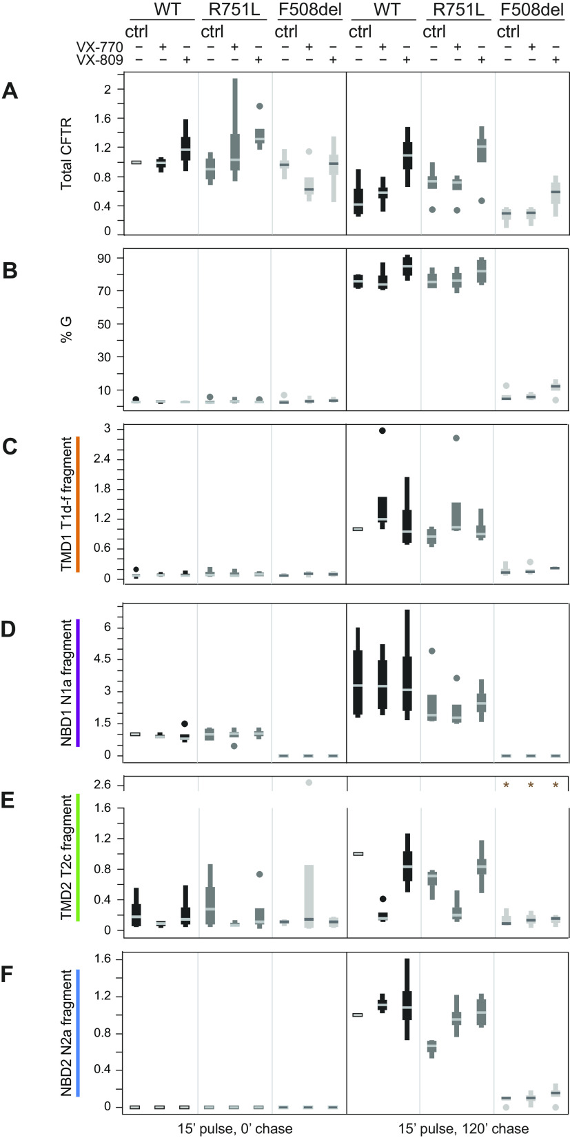 Figure 4. Quantification of total cystic fibrosis transmembrane conductance regulator (CFTR), %Golgi-modified form, and CFTR domain-specific fragments as shown in Fig. 3. A–F: quantification data for 4 independent experiments together with mean and SD values for the following. A: fold increase in the amount of total CFTR [endoplasmic reticulum form of CFTR (ER) + complex-glycosylated Golgi form of CFTR which has left the ER and resides in or beyond the Golgi complex including the plasma membrane (G)] relative to wild-type (WT)-CFTR. B: %Golgi-modified form [G/(ER + G). C–F shows the fold increase in the amount of folded CFTR domain-specific fragments relative to WT-CFTR in DMSO as follows: TMD1 (T1d-f/(ER + G) (C), NBD1 (N1a/(ER + G) (D), TMD2 (T2c/(ER + G) (E), and NBD2 (N2a/(ER + G) (F). Data in A and D have been normalized to WT-CFTR in DMSO (ctrl) at the 0-h (0′) chase for each experiment. Data in C, E, and F have been normalized to WT-CFTR in DMSO (ctrl) at the 2-h (120′) chase for each experiment. No samples at the 0-h chase contained N2a, and this time point has not been normalized. *One data point/condition was removed from lanes where the signal/noise ratio was less than 1.5× background. N1a, protease-resistant NBD1-specific fragment; N2a, protease-resistant NBD2-specific fragment; T1d-f, protease-resistant TMD1-specific fragments; T2c, protease-resistant TMD2-specific fragment. T1, T2, and N2 fragments represent domain assembly, which is a late-folding stage of CFTR.