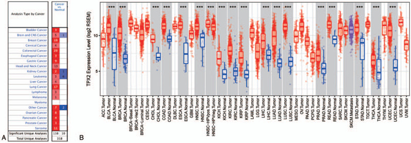 Figure 1. Expression of TPX2 in different types of human cancers. (A) Dysregulated expressions of TPX2 in datasets of different cancers compared with normal tissues are examined by Oncomine. (B) The TPX2 expression levels in different tumor types from the TCGA database in TIMER. âPâ<â.05, â Pâ<â.01, â¡Pâ<â.001. âTotal Unique Analysesâ is defined as total analyses included in the Oncomine database. âTotal Unique Analysesâ is defined as analyses that meet our stated threshold values.