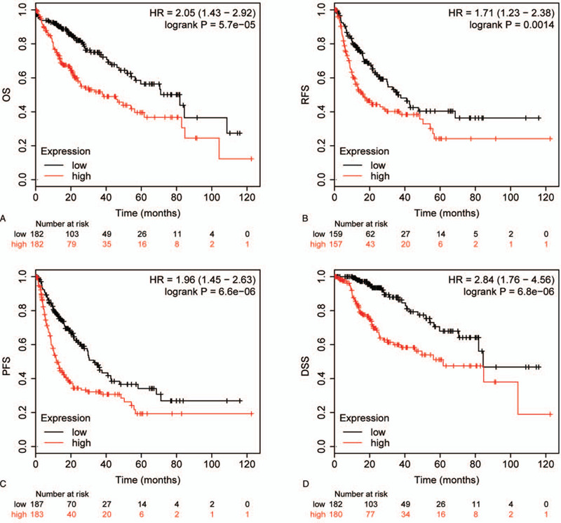 Figure 4. The prognosis effect of TPX2 expression in HCC. (A) OS curve showing the prognostic difference between patients with high expression of TPX2 and patients with low expression of TPX2. (B) PFS curve showing the prognostic difference between patients with high expression of TPX2 and patients with low expression of TPX2. (C) PFS curve showing the prognostic difference between patients with high expression of TPX2 and patients with low expression of TPX2. (D) DSS curve showing the prognostic difference between patients with high expression of TPX2 and patients with low expression of TPX2.