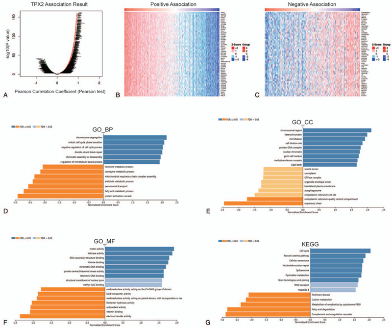 Figure 6. The genes coexpressed with TPX2 in HCC. (A) The global TPX2 highly associated genes identified by Pearson test in HCC cohort. (B) Heat maps showing top 50 genes positively associated with TPX2 in HCC. (C) Heat maps showing top 50 genes negatively associated with TPX2 in HCC. (D) Significantly enriched GO_BP annotations of TPX2 in HCC group. (E) Significantly enriched GO_CC annotations of TPX2 in HCC group. (F) Significantly enriched GO_MF annotations of TPX2 in HCC group. (G) Significantly enriched KEGG pathways of TPX2 in HCC group.