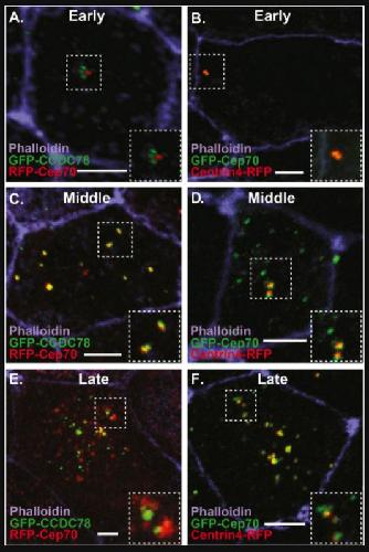 Fig. 2. Dynamic localization of Cep70 to the deuterosome. A-F Images of ectopic MCCs from embryos injected with the MCC inducing factor hGR-MCIDAS, treated with Dex and co-injected with RFP-Cep70 and the deuterosome marker GFP-CCDC78 (A, C, E) or GFP-Cep70 and the centriole marker Centrin4-RFP (B, D, F) stained with phalloidin. A-B, Early phase (2-3Hrs) of MCC development with Cep70 co-localizing to parental centrioles (B) but not nascent deuterosomes marked by CCDC78 (A). C-D, Middle phase (4-6Hrs) of MCC development showing FP-Cep70 co-localizing with GFP-CCDC78 at deuterosomes (yellow foci in E) but not at parental centrioles (red foci in C) and co-localizing with centrin4-RFP at parental centrioles (yellow foci in D) but not deuterosomes (green foci in D). Late phase (>6Hrs) of MCC development showing FP-Cep70 co-localizing with GFP-CCDC78 at deuterosomes (yellow foci in E) but not at presumptive nascent centrioles (red foci in E) and co-localizing with Centrin4-RFP at nascent centrioles (yellow foci in F) but not presumptive deuterosomes (green foci on F). Scale bar is 5μm. |