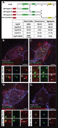 Fig. 3. Different domains of Cep70 contribute to different cellular localizations. A, Domain map of Cep70 and description of the 4 individual domain constructs used in B-E along with quantification of localization for each construct (n â> â30 âcells for each condition). Scale bars are 5μm. B-E, Localization of GFP-CCDC78 (green) and RFP-Cep70 (red) domain constructs in mature MCCs stained with phalloidin (purple) with boxed areas blown up and shown without phalloidin both top and side projections. B, RFP-Cep70-C1 localizing weakly at the level of basal bodies (arrowhead) and in cytoplasmic aggregates (white arrow). C, RFP-Cep70-C2 localizing strongly at the level of basal bodies (arrowhead) and in cytoplasmic aggregates (white arrow). D, RFP-Cep70-CC localizing weakly at the level of basal bodies (arrowhead) and in cytoplasmic aggregates (white arrow). E, RFP-Cep70-Cep70M localizing very weakly at the level of basal bodies (arrowhead) and at the deuterosome (green arrow). |