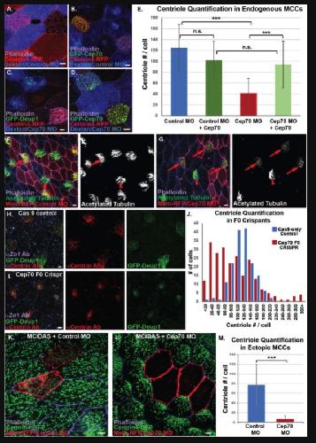 Fig. 4. Cep70 is required for centriole amplification. A-E, MO analysis in endogenous MCCs. A, MCCs from embryos injected with Centrin-RFP (red) and mosaically with Control MO marked with Dextran (blue) stained with phalloidin (purple). B, MCCs from embryos injected with Centrin-RFP (red) and mosaically with Control MO marked with Dextran (blue) together with GFP-Cep70 and stained with phalloidin (purple). C, MCCs from embryos injected with Centrin-RFP (red), GFP-Deup1 (green) and mosaically with Cep70 MO marked with Dextran (Blue) stained with phalloidin (purple). D, MCCs from embryos injected with Centrin-RFP (red) and GFP-Cep70 (green) mosaically with Cep70 MO marked with Dextran (blue) stained with phalloidin (purple). E, Quantification of centriole number in embryos from conditions imaged in A-D (âââp<0.001, n.s. not significant, n â> â85 âcells). F, Mosaic embryo showing strong cilia staining with acetylated tubulin (green/white) in both WT cells (arrowhead, not red) and in control MO cells (arrow, red), stained with phalloidin (purple). G, Mosaic embryo showing strong cilia staining (green/white) in WT cells (arrowhead, not red) but not in Cep70 MO cells (arrow, red), stained with phalloidin. H-J, CRISPR analysis in transgenic Tub-GFP-Deup1 (green) embryos. H, Cas9 alone control embryo stained with anti-centrin mAb (red) and phalloidin (purple). I, MCCs (green) from embryos injected with Cas9 and Cep70 sgRNA stained with anti-centrin mAb (red) and phalloidin (purple). J, Quantification of centriole number in MCCs from F0 crispant embryos; data is presented as a histogram of the number of cells observed in each bin (as labeled, n â> â167 âcells). K-M, MO analysis in hGR-MCIDAS induced ectopic MCCs. K, MCCs from embryos uniformly injected with hGR-MCIDAS and centrin-GFP (green) and mosaically with control MO together with mem-RFP as a marker (red) and stained with phalloidin (purple). L, MCCs from embryos uniformly injected with hGR-MCIDAS and centrin-GFP (green) and mosaically with Cep70 MO together with mem-RFP as a marker (red) and stained with phalloidin (purple). K, Quantification of the average centriole number from MCCs from conditions in I-J(âââp<0.001, n > 107 âcells). Scale bars are 5μm. |
