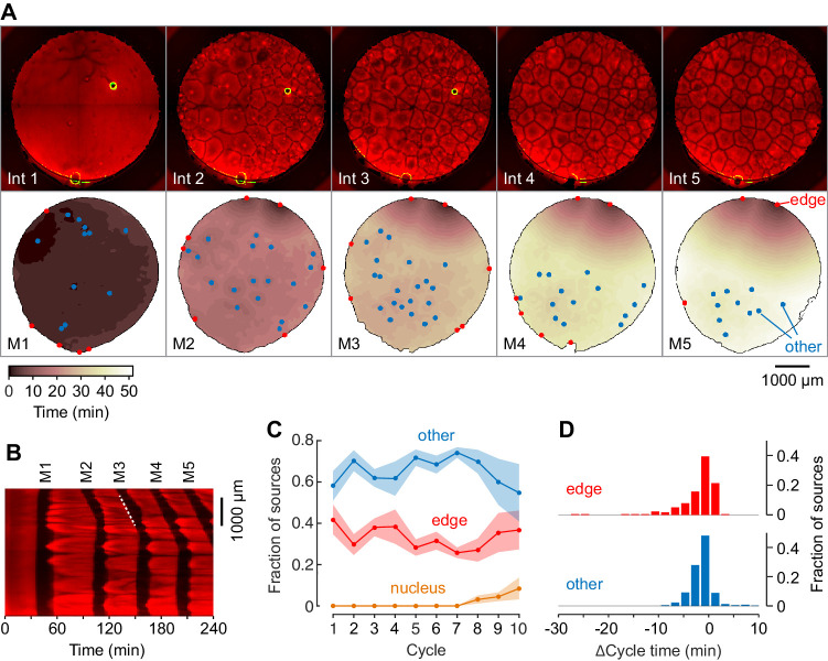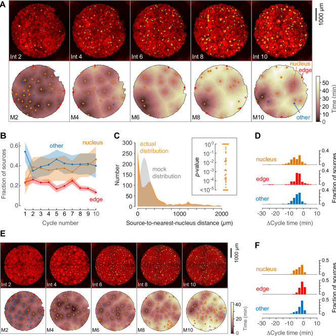 Mitosis is a dramatic process that affects all parts of the cell. It is driven by an oscillator whose various components are localized in the nucleus, centrosome, and cytoplasm. In principle, the cellular location with the fastest intrinsic rhythm should act as a pacemaker for the process. Here we traced the waves of tubulin polymerization and depolymerization that occur at mitotic entry and exit in Xenopus egg extracts back to their origins. We found that mitosis was commonly initiated at sperm-derived nuclei and their accompanying centrosomes. The cell cycle was ~20% faster at these initiation points than in the slowest regions of the extract. Nuclei produced from phage DNA, which did not possess centrosomes, also acted as trigger wave sources, but purified centrosomes in the absence of nuclei did not. We conclude that the nucleus accelerates mitotic entry and propose that it acts as a pacemaker for cell cycle.