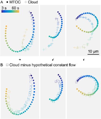 Figure 5—figure supplement 1. Hypothetical constant flow permeating asters can improve registration between MTOC and center of fluorescein cloud.(Related to Figure 5) (A) Trajectory of MTOC (circle) and center of the fluorescein cloud, within aster oscillating on HOOK2-functionalized coverslip, same as Figure 5F. (B) Trajectory of MTOC (circle) and center of the fluorescein cloud after computationally subtracting a constant flow (square). Flow direction and magnitude shown as a black arrow above each panel. The hypothetical constant flow was optimized to minimize the difference between the MTOC and cloud trajectories.Figure 5—figure supplement 1—source data 1. Width of the fluorescein cloud vs time for panel E, and MTOC and cloud center trajectories for panel F.The ‘driftVec’ variables are the hypothetical constant flow that was optimized to minimize the difference between the MTOC and cloud trajectories for Figure 5—figure supplement 1. |