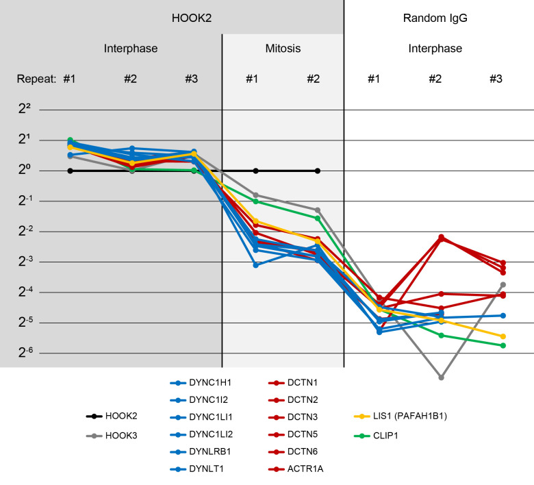 Figure 4—figure supplement 1. Characterization of the HOOK2 C-terminal peptide antibody.(Related to Figures 4, 5 and 8) We performed immunoprecipitation-mass spectrometry (IP-MS) on Protein G Dynabeads functionalized with anti-HOOK2. In three repeat extracts, we measured three conditions: anti-HOOK2 in interphase extracts (columns 1 to 3), anti-HOOK2 in mitotic extracts (columns 4 and 5), and as negative control, random IgG in interphase (columns 6 through 8). HOOK2 conditions were normalized so the amount of HOOK2 was constant. Random IgG conditions were normalized to have the same IgG count as the average IgG count of the HOOK2 columns. Then for each protein, the sum across channels was normalized, so the abundance values represent relative enrichment across the eight channels. Abundances are shown on a log scale with base 2. We here show dynein subunits (blue), dynactin subunits (red), and other proteins known to interact with dynein-dynactin (yellow, green) that came down in the immunoprecipitations. The interaction between HOOK2 and the dynein-dynactin complex was stronger in interphase (left columns) than in mitosis (middle columns).Figure 4—figure supplement 1—source data 1. Immunoprecipitation-mass spectrometry (IP-MS) counts for Figure 4—figure supplement 1. |