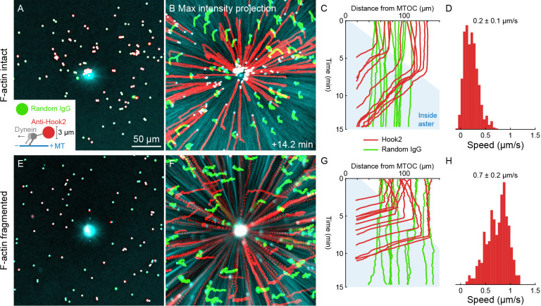 Figure 8. Unlike organelles, artificial cargoes functionalized with dynein move at constant speed throughout asters.(A) Artificial cargoes were functionalized with an antibody against the dynein adapter HOOK2, and negative control beads were functionalized with random antibody (see Video 12). (B) Max intensity projections of beads functionalized with anti-HOOK2 (red) or random antibody (green). (C) Trajectories of anti-HOOK2 and negative control beads relative to the MTOC. The growing aster is indicated by the blue region. Anti-HOOK2 beads started to be transported when they were engulfed by the growing aster. (D) Velocity distribution of anti-HOOK2 beads inside the aster. (EâH) Similar experiment with F-actin fragmented by Cytochalasin D.Figure 8âsource data 1. Bead trajectories for panels C, D, G, and H.The âbeadsâ variables are structures that contain the bead trajectories in XY, as well as the distance from the MTOC at the aster center. The âTinsideAsterâ variables are the time index at which beads first enter the aster, which was used to generate the velocity distributions in panels D and H. |
