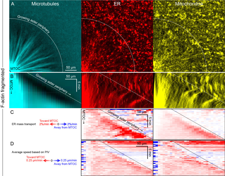 Figure 7—figure supplement 1. Like other organelles, mitochondria exhibited a burst of organelle movement near the growing aster periphery.(Related to Figures 6 and 7, Video 11) (A) F-actin was fragmented by Cytochalasin D. Microtubules were labeled with tubulin-Alexa Fluor 647, ER with DiD, and mitochondria with TMRE. (B) Kymographs along a line from the MTOC. (C) Mass transport map for ER and mitochondria averaged over a quadrant, in the same frame of reference as the kymographs in panel B. Mass transport analysis is described in Figure 7—figure supplement 2. (D) Average speed based on PIV, in the same frame of reference as panels B and C, and averaged over a quadrant. In all analysis methods, mitochondria behaved similar to acidic organelles and likewise exhibited a burst of movement at the growing aster periphery. |