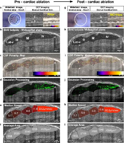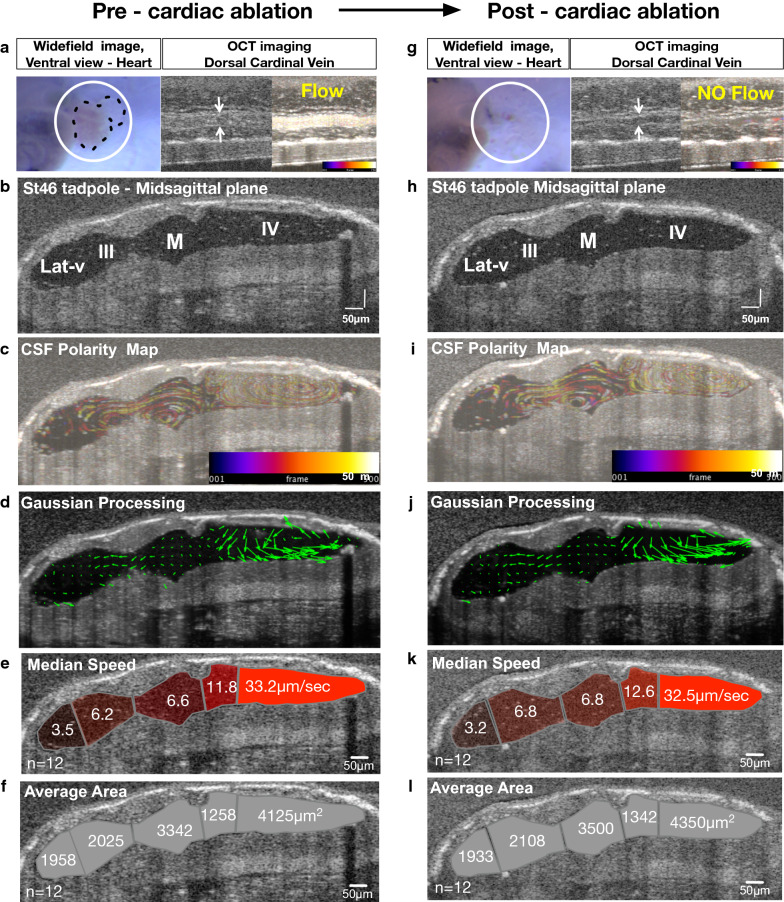 Fig. 4. In Xenopus tropicalis polarized embryonic CSF circulation forms independent of cardiac forces. a, g Widefield image of the heart vicinity and OCT image of the dorsal cardinal vein of a stage 46 tadpole. White circle outlines the cardiac sac. Black dotted line marks the heart and the outflow tract of the tadpole pre-cardiac ablation. The absence of the heart is shown post-cardiac ablation. White arrows point to the outer vein walls and a temporally color-coded image indicates the presence or absence of blood flow. b, h Mid-sagittal plane in vivo OCT image of the ventricular space. c, i CSF polarity flow map. d, j Post-Gaussian processing CSF flow map. e, k Median compartmental median CSF flow speed. f, l Average compartmental area. (Additional file 10: Movie S8). CSF: cerebrospinal fluid; OCT: optical coherence tomography, Lat-v: lateralventricle, III: 3rd ventricle, M: midbrainventricle, IV: 4th ventricle