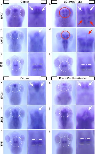c21orf59 knockdown results in expanded emx1 expression caudally to the diencephalon and mesencephalon regions indicated by red arrows. c Normal expression of lhx1 mRNA in a stage 46 wild-type tadpole. Expression is strong around the thalamic region as indicated by a white arrow and extends to the diencephalon. d