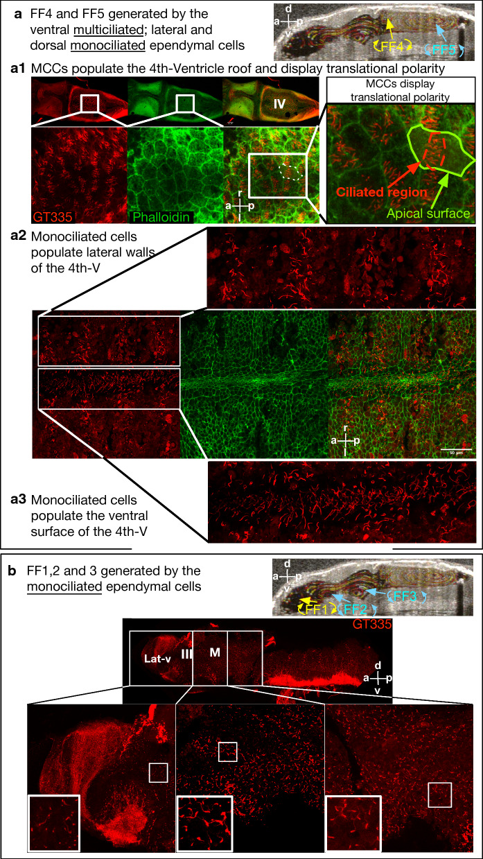 Fig. 6. Xenopus tropicalis ventricular cilia distribution in brain explants (Stage 46). a Mid-sagittal OCT image showing flow fields 4 and 5. a1 Brain stained with an anti-GT335 antibody (red) which labels cilia, and with phalloidin (green) which labels actin to mark cell borders. The dorsal fourth ventricle roof is populated with MCCs that display translational polarity. a2 The lateral walls of the 4th ventricle displays monociliated cells. a3 The ventral surface of the 4th ventricle populated with monociliated cells. b The lateral, third, and midbrain ventricles show a dense population of monociliated cells. Lat-v: lateralventricle, III: 3rd ventricle, M: midbrainventricle, IV: 4th ventricle, CA: cerebral aqueduct, FF: flow field