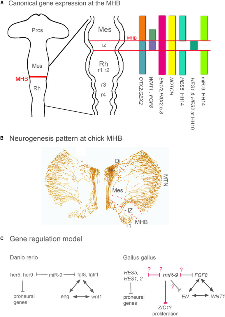 FIGURE 1. Gene expression, neurogenesis and gene regulation around the MHB. (A) Summary of gene expression patterns around the MHB. Otx2, Gbx2, Wnt1, Fgf8, En1/2, Pax2 -5 -8, and Notch are expressed in a similar pattern in all vertebrates. The expression pattern of Hes genes however differs between vertebrate species. For instance, the pattern of zebrafish her 9 is similar to that of chick HES5. (B) Pattern of neurogenesis around the chick MHB at HH17 (∼E3). Differentiated neurons were labeled with an antibody against medium weight neurofilament (RMO-270). The IZ lacks neurons at this stage, and in midbrain only the dorsally located MTN neurons have developed. ICN neurons are located in ventral diencephalon and form the medial longitudinal tract left and right of the FP. In r1 ventral and dorsal neurons have differentiated. (C) In all vertebrates studied, during the maintenance phase, Wnt1, Fgf8, Pax2/5/8, and En genes regulate each other to maintain the MHB. In zebrafish and chick, miR-9 suppresses Fgf8 expression and thus indirectly the expression of Wnt1, Pax, and En genes. The difference between both species is in the miR-9 targeting. In chick, Fgf8, and En1 are target genes of miR-9; where the former shows experimental reduction and the later is inconsistent (Alwin Prem Anand et al., 2018). In zebrafish, miR-9 promotes neurogenesis by inhibiting different Hes genes around and within the IZ (her9 and her5, respectively). In chick, none of the Hes genes expressed in and around the IZ are miR-9 targets (pink arrows). miR-9 OE in chick resulted in immature neurogenesis only in r1 and IZ but not in midbrain, These results suggests that at least in chick IZ and in hindbrain genes of the Hes pathway could be inhibited by miR-9. In chick midbrain, like in Xenopus telencephalon (Bonev et al., 2011) growth is reduced but without an effect on cell death as in Xenopus, which might be mediate by inhibiting the Wnt activator Zic1. The Models are modified from Rhinn and Brand (2001) and Delaloy and Gao (2008). Di, diencephalon; FP, floor plate; INC, interstitial nucleus of Cajal; IZ, intervening zone; MES, mesencephalon; MHB, mid-hindbrain boundary; MTN, mesencephalic trigeminal nucleus; Pros, prosencephalon; Rh, rhombencephalon; r1 to 4, rhombomeres 1–4. |