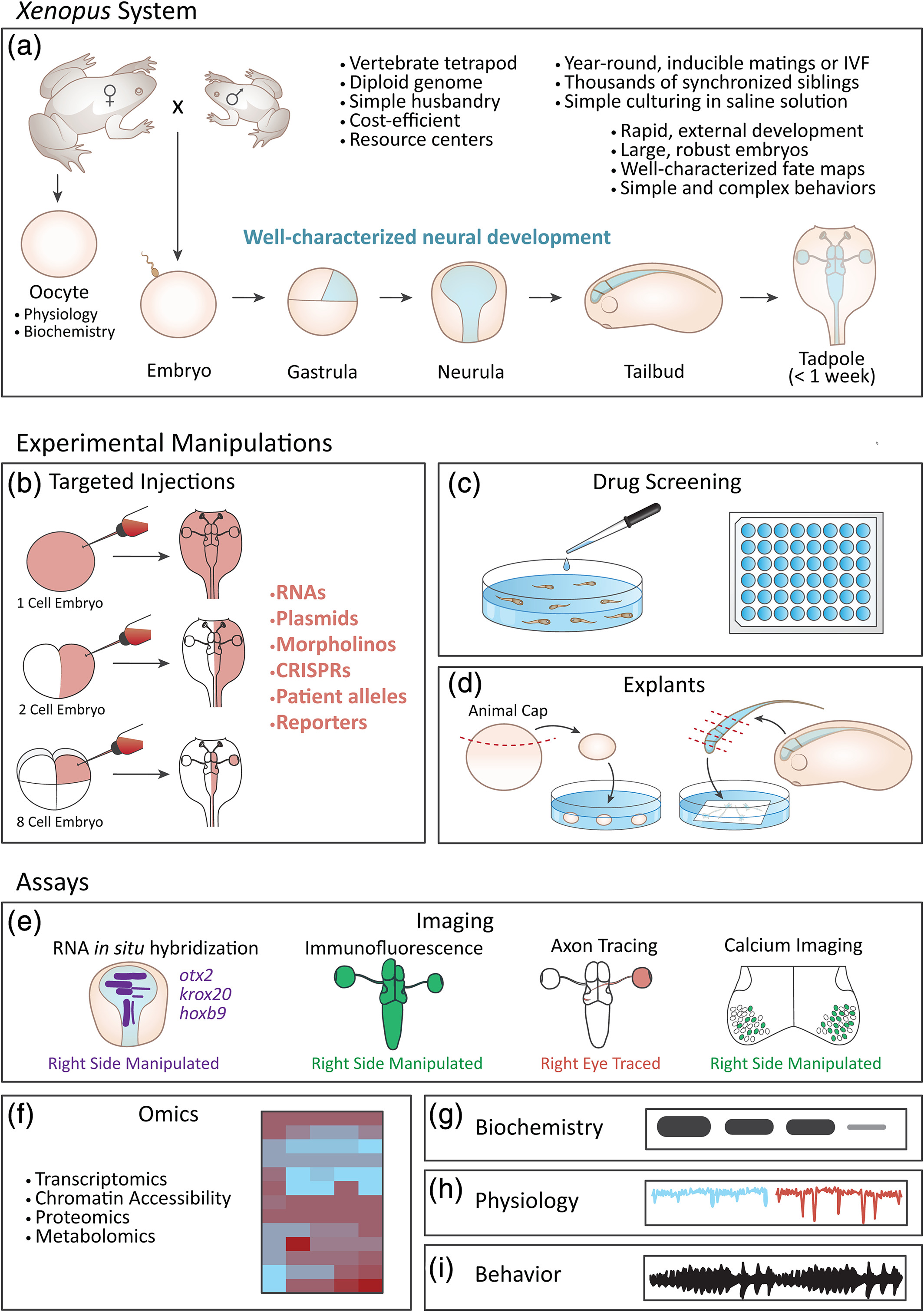 FIGURE 1 Summary of key techniques used in Xenopus to study brain development. Several important techniques core to the Xenopus neurodevelopmental biology toolkit are diagrammed here, although the authors note that this figure is not meant to be an exhaustive summary of available technologies, and that these methods are also applicable to the study of other developmental processes. Top panel (a): Summary of advantages of the Xenopus systems and brief overview of central nervous system development. Light blue indicates neural tissues at the embryonic and larval stages shown. Orientations: lateral view with animal pole to the top (oocyte, embryo), lateral view with dorsal to the right (gastrula), dorsal view with anterior to the top (neurula and tadpole), lateral view with anterior to the left (tailbud). Middle panels (bâd): common techniques used to manipulate Xenopus development, including targeted injection with any of several reagents (b), treatment with pharmacological agents (c), and two examples of explant techniques (d). Note that these methods can be used separately or in combination, as appropriate for the scientific questions of interest. Bottom panels (eâi): common methods for characterizing typical development or assessing the consequences of experimental manipulations (see bâd) on development. Diagrams depict hypothetical example results based on data from several references; see text for citations. In (e), from left to right: mRNA in situ hybridization shows a reduction in krox20 and hoxb9 expression, a posterior shift in krox20 expression, and no change in otx2 expression on the injected side of a unilaterally manipulated embryo; staining with an antibody against a panâneural protein shows reduced brain size on the injected side of a unilaterally manipulated embryo; tracing shows axon projections from the right eye to the left tectum; calcium imaging shows increased activity on the injected side of a unilaterally manipulated embryo. (f) A heatmap from an omics analysis. (g) Western blot results from a coâimmunoprecipitation experiment. (h) Results comparing excitatory postâsynaptic current (EPSC) recordings from a control animal (blue) and a manipulated sibling (red). (i) Sound pulses from an advertisement vocal call |