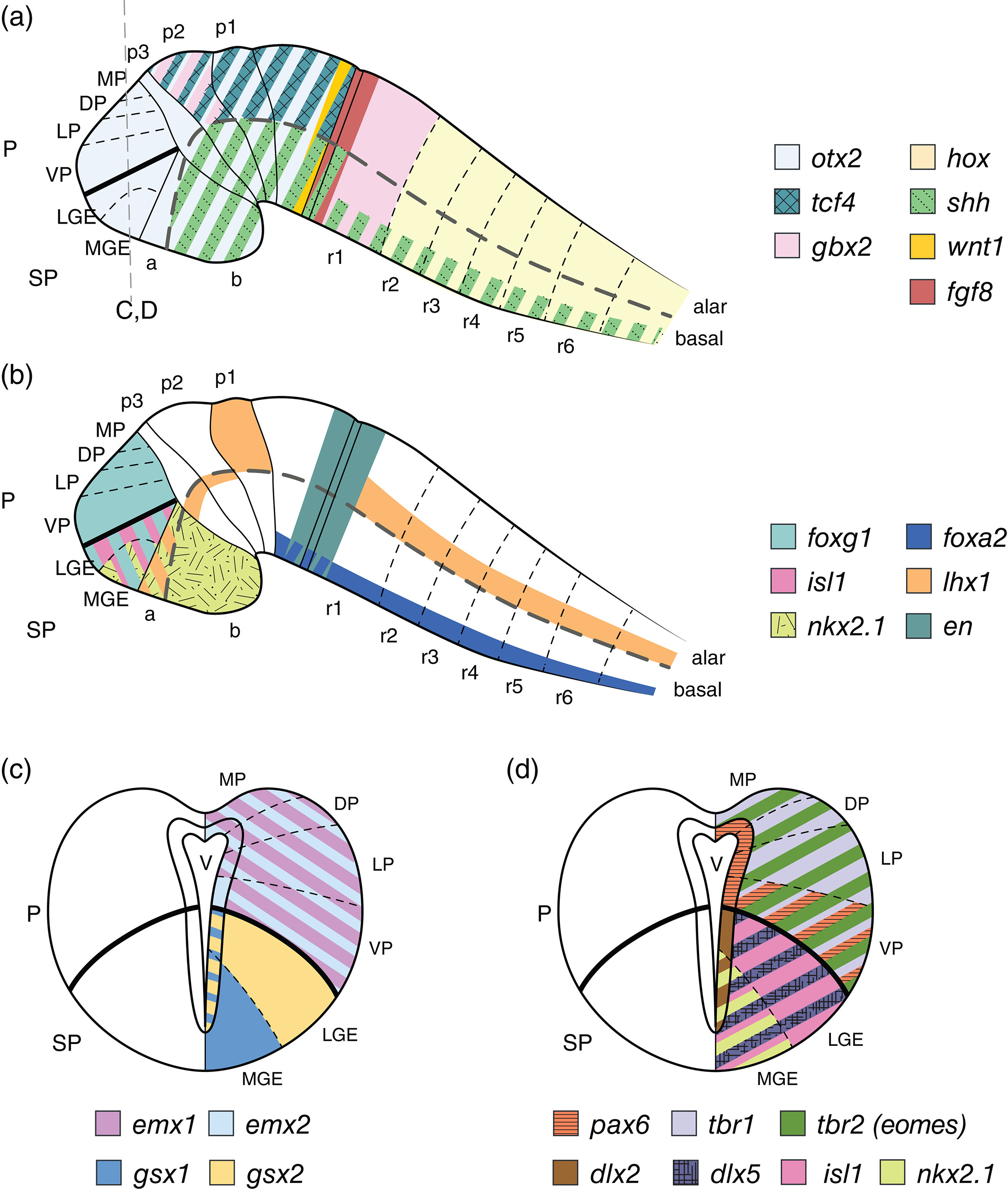 Genes referenced: dlx2 dlx5 egr2 emx1 emx2 en1 en2 eomes fgf8 foxa2 foxg1 gbx2 gsx1 gsx2 hoxb9 isl1 lhx1 nkx2-1 otx2 pax6 shh tbr1 tcf4 wnt1