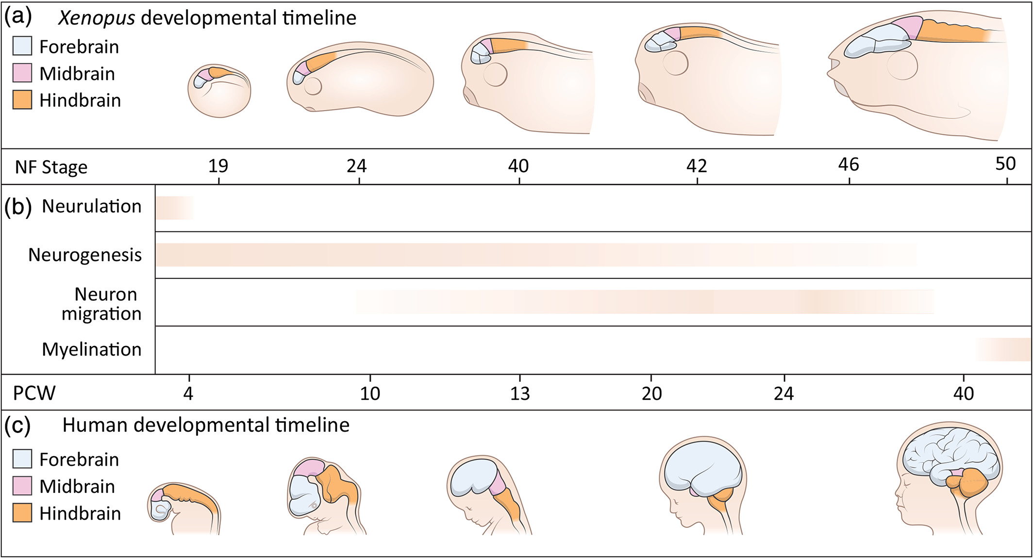 From its long history in the field of embryology to its recent advances in genetics, Xenopus has been an indispensable model for understanding the human brain. Foundational studies that gave us our first insights into major embryonic patterning events serve as a crucial backdrop for newer avenues of investigation into organogenesis and organ function. The vast array of tools available in Xenopus laevis and Xenopus tropicalis allows interrogation of developmental phenomena at all levels, from the molecular to the behavioral, and the application of CRISPR technology has enabled the investigation of human disorder risk genes in a higher-throughput manner. As the only major tetrapod model in which all developmental stages are easily manipulated and observed, frogs provide the unique opportunity to study organ development from the earliest stages. All of these features make Xenopus a premier model for studying the development of the brain, a notoriously complex process that demands an understanding of all stages from fertilization to organogenesis and beyond. Importantly, core processes of brain development are conserved between Xenopus and human, underlining the advantages of this model. This review begins by summarizing discoveries made in amphibians that form the cornerstones of vertebrate neurodevelopmental biology and goes on to discuss recent advances that have catapulted our understanding of brain development in Xenopus and in relation to human development and disease. As we engage in a new era of patient-driven gene discovery, Xenopus offers exceptional potential to uncover conserved biology underlying human brain disorders and move towards rational drug design.