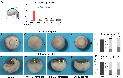 Fig 3. Rnd1 and Shirin are essential for gastrulation. (A) Rnd1 and Shirin expressions are enriched in the mesoderm. RT-qPCR from dissected tissue. mRNA levels in ectoderm and mesoderm, normalized to homogenously expressed ODC. Three to 6 experiments, pairwise 1-sided Student t test. Refer to S1 Data. (BâE) Whole embryo loss-of-function phenotypes: 4-cell stage embryos were injected in the dorsal side (d) with a control (COMO), Rnd1 (RndMO), or Shirin (ShiMO) morpholinos. Embryos were fixed and imaged at stage 11. (B-D) Examples of typical control mesoderm and RndMO and ShiMO phenotypes. (E) Example of a âpartialâ phenotype (here ShiMO). (BâE) External views from the vegetal pole. Red arrows point to the position of the dorsal blastopore lip of a control embryo, absent in RndMO (C) and ShiMO (D) embryos. (E) In the partial phenotype, the lip is present but the blastopore has remained widely open compared to control. In many embryos, the ventral blastopore is also affected, due to the diffusion of the morpholinos to the ventral blastomeres before complete separation after the 2nd cleavage. (BââEâ) Sagittally bisected embryos. In a control embryo (Bâ), the extent of involution (dashed black arrow) can be seen by the position of the tip of the mesendoderm (white arrow) that has moved far away from the blastopore lip (red arrow). (Câ) RndMO embryo lacking any sign of involution. The white arrowhead points to the dorsal edge of the blastocoel cavity (bl), resembling that of a pregastrula embryo. (Dâ) Characteristic ShiMO phenotype, with flat blastocoel floor (white arrow) and thicker non-involuted dorsal marginal zone (black arrowheads), both indicative of failed involution. (Eâ) Partial involution (white arrow). Yellow arrowheads: thin BCR, indicative of ectoderm epiboly in all conditions. Scale bars: 200 μm. (F, Fâ) Score of the penetrance of the gastrulation external and internal phenotype: N, normal embryo; P, partial inhibition, C, complete inhibition. Comparison by 1-way ANOVA followed by Tukey HSD post hoc test. Refer to S1 Data. ANOVA, analysis of variance; HSD, honestly significant difference; ODC, ornithine decarboxylase; RT-qPCR, reverse-transcription quantitative PCR. https://doi.org/10.1371/journal.pbio.3001060.g003 |