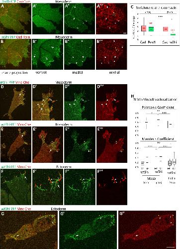 Fig 1. Distinct properties of ectoderm and mesoderm at the cellular level. (AâE) Organization of cell-matrix adhesive structures. Dissociated Xenopus ectoderm (A, C) and mesoderm (B, D) cells expressing Vinc-Che and mYFP were plated on FN, either as single cells (A, B) or as small groups (C, D) and imaged live by spinning disc confocal microscopy. y: autofluorescence of yolk platelets. Ventral: ventral z plane close to the glass. max p: Maximal z projection. (A) Ectoderm cells do not spread on FN, but adhere to it through a characteristic adhesive ring (A, Aâ, filled arrowheads). They typically form blebs that are continuously pushed around the cell (dashed line with arrow). Right inserts: orthogonal view (orth) showing the cross-section of the membrane and of the vinculin ring (filled arrowheads). The dashed line underlines the bottom of the bleb. (B) Mesoderm cells spread on FN and extend multiple lamellipodia. They transiently polarize during their migration, with 1 protrusion becoming the tail (t); see also time lapse S1 Fig. They form vinculin-positive FAs (filled arrowheads), generally oriented in the direction of the protrusions (arrows). (C) Ectoderm cells form compact groups, with few protrusions in the center and numerous blebs at the periphery (dashed lines). External cells emit protrusions under the more central cells (yellow arrows). Individual cells build partial adhesive structures (filled arrowheads), which together form a supracellular ring. (D) Mesoderm cells form looser groups, each cell emitting multiple lamellipodia, most of them extending outwards (white and yellow arrows indicate peripheral and internal lamellipodia, respectively), with numerous FAs oriented radially (arrowheads). Panel Dâ is an enlargement of the boxed portion of panel D. Scale bars: A, C, D 10μm; B 20μm; Dâ 5μm. (E) Quantification of vinculin accumulation at FAs of isolated cells, expressed as Vinc-Che fluorescence concentrated in clusters divided by the total fluorescence along the ventral cortex. A color code is used throughout the figures, including blue for control ectoderm and red for control mesoderm. The box plots show the interquartile range (box limits), median (center line and corresponding value), and min and max values without outliers (whiskers). Statistical comparison using 2-sided Student t test. For all experiments presented in this study, P values are indicated as follows: *P < 0.05, **P < 0.01, ***P < 0.001; NS, not significant. The same color code is also used to indicate statistical comparison between 1 condition and control ectoderm (blue) or control mesoderm (red). Other comparisons are indicated by black asterisks and brackets. The numbers in parentheses correspond to the number of cells/ number of experiments. Refer to S1 Data. (F) Single-cell motility. Frames of spinning disc confocal time-lapse movies. Cells expressed paxillin fused to YFP (Pax-YFP) and membrane Cherry. (F) Ectoderm cells are immobile, anchored by their stationary adhesive ring (arrowheads) and bleb (star). Scale bars: F 5 μm; Fâ 20 μm. (Fâ) Mesoderm cells actively migrate, rapidly remodeling protrusions and FAs (red-yellow-green color-coded arrows and arrowheads indicate successive positions respectively of 1 extending lamellipodium and the retracting tail). White arrowheads: FAs at thin protrusions. (G) Quantification of single-cell migration. Refer to S1 Data. (H) Adhesion assay. Dissociated cells were plated on the adherent substrate, either FN or recombinant cadherin-Fc fusion protein, then subjected to rotation. Adhesion is expressed as the percentage of cells remaining adherent after rotation (see Materials and methods). The column plots show averages and standard deviation of 15 experiments, a total of approximately 5,000 cells/conditions. Statistical comparison on the % adherent cells/experiment, pairwise 2-sided Student t test. Refer to S1 Data. FA, focal adhesion; FN, fibronectin; mYFP, membrane-targeted yellow fluorescent protein; Vinc-Che, Vinculin-Cherry; YFP, yellow fluorescent protein. https://doi.org/10.1371/journal.pbio.3001060.g001 |