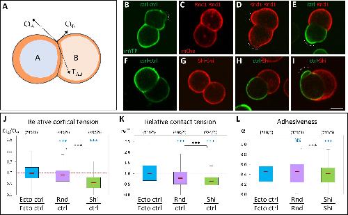 Fig 8. Ectopic expression of Rnd1 or Shirin modulates ectoderm cortical tension and adhesiveness. (A) Diagram of an asymmetrical cell doublet, representing the balance between cortical tensions at free edges CtA, CtB, and contact tension TAB. The orange layer symbolizes the actomyosin cortex. The curved cellâcell interface reflects unequal CtA and CtB tensions. (BâI) Examples of homotypic and heterotypic doublets, imaged by live confocal microscopy. Doublets were made by combining dissociated control ectoderm expressing mYFP (ctrl) and either Rnd1 or Shirin-expressing cells markerd with mCherry. Wild-type and Rnd1-expressing cells often displayed blebs (dashed lines). Curved interfaces indicative of tensile differences were observed for all combinations, including for homotypic doublets (e.g., panel F), but were most systematically found for heterotypic ctrl-Shirin doublets (H, I). Scale bar: 20 μm. (JâL) Relative tension measurements based on the geometry at cell vertices (see S1 Appendix). (J) Relative cortical tension between Rnd1 or Shirin-expressing cells and control ectoderm cells calculated from the ratio CtA/CtB of heterotypic doublets. The ratio for control homotypic doublets is provided for comparison. See S1 Appendix for complete measurements. Vertices flanked by a bleb (D and I) were omitted from calculations. (K) Relative strength of contact tension TAB at homotypic contacts, compared to control ectoderm-ectoderm T, the median of which was set arbitrarily at 1. See S1 Appendix for more details. (L) Relative adhesiveness α, calculated for homotypic doublets. Numbers in brackets: vertices/experiments. Statistical comparison using 1-way ANOVA followed by Tukey HSD post hoc test. Refer to S1 Data. ANOVA, analysis of variance; HSD, honestly significant difference. https://doi.org/10.1371/journal.pbio.3001060.g008 |