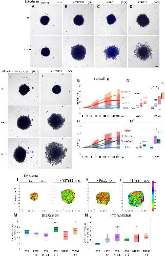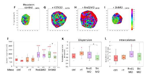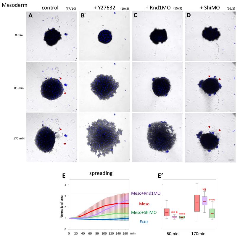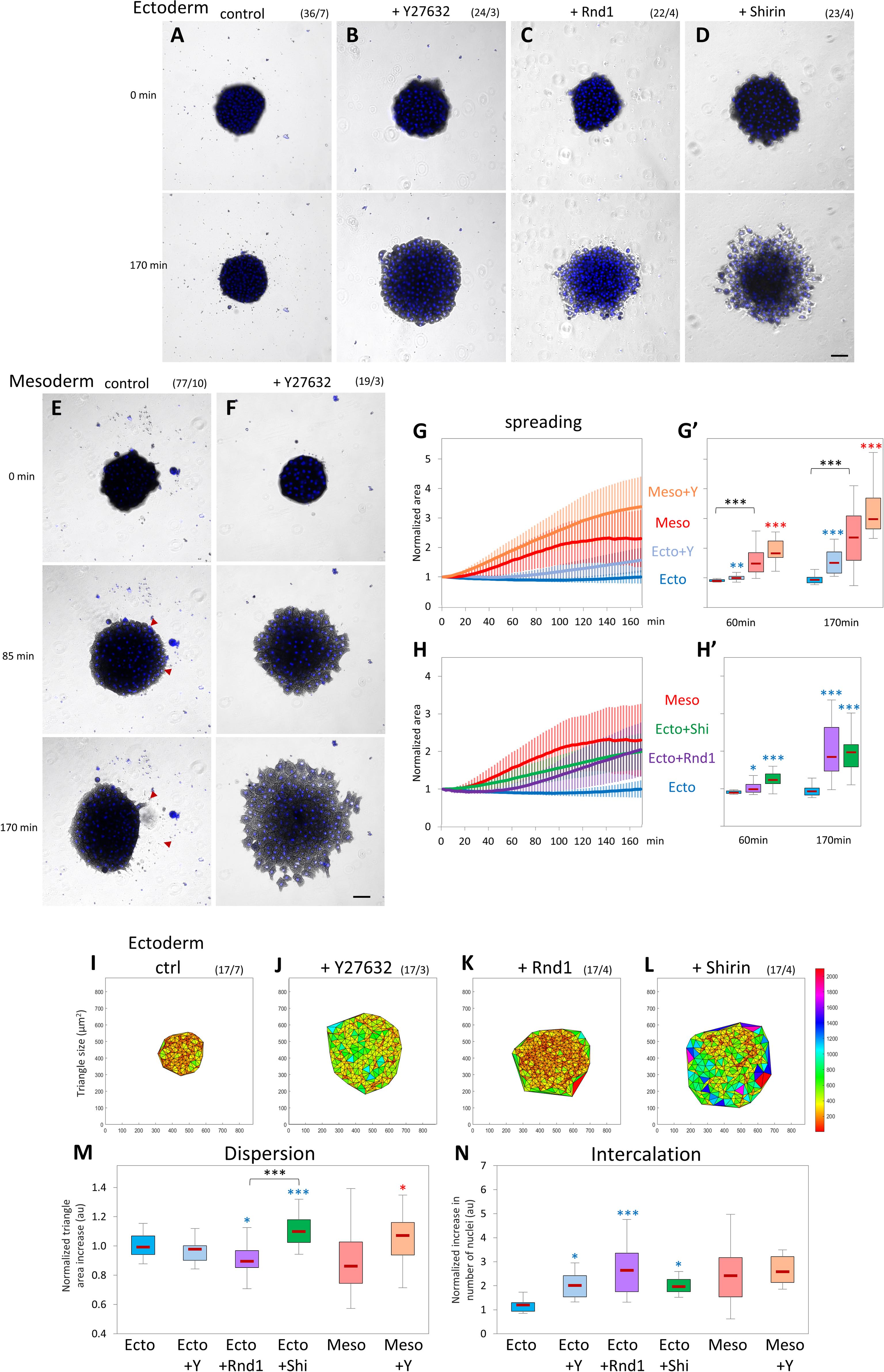 Fig 9. Rho/Rock regulation affects collective migration of ectoderm and mesoderm tissue explants. Tissue explants were laid on FN, and their spreading was imaged for 170 minutes. (AâD) Control ectoderm, ectoderm treated with 50-μM Y27632, and ectoderm expressing Rnd1 or Shirin. Numbers in brackets are number of explants and number of experiments. Scale bar: 100 μm. (E, F) Control mesoderm and mesoderm treated with Y26862. Red arrowheads in E indicate areas of large-scale retractions (compare 85 and 170 minutes). Scale bar: 100 μm. (G, H) Quantification of explant spreading. After segmentation, the area was calculated for the time course and normalized to the first time point. Traces show average time course curves with SD for the various experimental conditions. (Gâ, Hâ) Corresponding relative spreading after 60 minutes and 170 minutes, chosen to represent an intermediate and advanced stage of the spreading process. Statistical analysis, 1-way ANOVA followed by Tukey HSD post hoc test. Refer to S1 Data. (IâM) Delaunay triangulation of nuclei and quantification of cell dispersion. (IâL) Representative maps of triangulated nuclei after 170 minutes of imaging. X and Y labels mark the coordinates in μm, and the color-coded scale bar indicates the area of the triangles in μm2. (M) Quantification of the relative change in triangle size over time calculated by dividing the average triangle area at 170 minutes by that at 30 minutes. The 30-minute time point was chosen as it corresponds to the stage when explant had adhered to the substrate and started to spread. (N) Quantification of intercalation calculated by dividing number of nuclei at the ventral surface at 170 minutes by the number at 30 minutes. Statistical comparisons: 1-way ANOVA followed by Tukey HSD post hoc test. Refer to S1 Data. ANOVA, analysis of variance; FN, fibronectin; HSD, honestly significant difference; Rock, Rho-kinases; SD, standard deviation. https://doi.org/10.1371/journal.pbio.3001060.g009 |