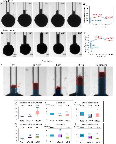 Fig 10. ROCK inhibition and Rho regulators modulate tissue stiffness, viscosity, and surface tension. Micropipette aspiration was used to measure physical properties of tissue explants. Explants were aspirated into the pipette at constant pressure, then pressure was reset to 0 to let the explant retract. (A, B) Examples of aspiration and retraction of control ectoderm and mesoderm explants. Aspiration pressure was 250 Pa. Pressure was released after 240 seconds. Scale bars: 100 μm. (Aâ, Bâ) Corresponding aspiration and release profiles. The blue double arrows indicate the extent of deformation of the tissue during the first 20 seconds, defined as the fast âpassiveâ phase. The 2 slow, linear phases of aspiration and release, highlighted in red, were used to calculate viscosity and TST. Scale bars: 100 μm. (C) Examples of aspiration of control ectoderm, ectoderm treated with Y26862, or expressing Rnd1 or Shirin, and control mesoderm. Pressure was 250 Pa. Images display the frame corresponding to the deformation 220 seconds after the initiation of aspiration. The colored overlays indicate the distances of deformation during the first fast phase (20 seconds, blue) and during the subsequent slow phase (220 seconds, red). Scale bar: 100 μm. (DâI) Calculated parameters: (D, G) Length of deformation 20 seconds after initiation of aspiration, encompassing the initial passive phase. (E, H) Tissue viscosity calculated from the rates of aspiration and retraction (see Materials and methods). (F, I) TST. Numbers in brackets are number of explants and number of experiments. Statistical comparisons: 1-way ANOVA followed by Tukey HSD post hoc test. Refer to S1 Data. ANOVA, analysis of variance; HSD, honestly significant difference; Rock, Rho-kinases; TST, tissue surface tension. https://doi.org/10.1371/journal.pbio.3001060.g010 |
