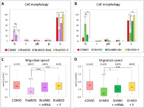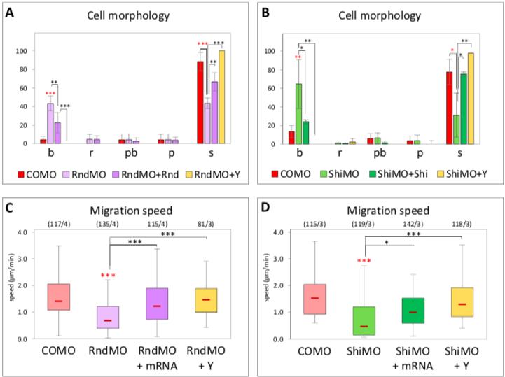 S4 Fig. (Related to Fig 4) (AâD) Rescue of Rnd1MO and ShiMO spreading and migration phenotypes. Four-cell stage embryos were injected in the dorsal side with COMO, RndMO, RndMO + YFP-Rnd1 mRNA (rescue), ShiMO, or ShiMO + YFP-Shirin mRNA (rescue). Dissociated mesoderm cells were plated on FN and time-lapse movies were recorded. The fourth condition represents RndMO or ShiMO cells treated with 50μM Y27632 Rock inhibitor (Y). Statistical comparions: 1-way ANOVA followed by Tukey HSD post hoc test. Red asterisks: Comparison to COMO. |