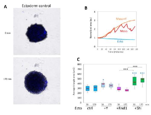 S7 Fig. (Related to Fig 9) (A) Example of ectoderm explant showing late partial spreading, which is only observed beyond the 120 minutes. (B) Examples of traces for single explants, illustrating the irregular expansion of mesoderm explants interrupted by retractions. In contrast, expansion of Y26862-treated mesoderm is smooth. (C) Quantification of average triangle size at the initiation of spreading (30 minutes) and the end of the time lapse (170 minutes). Refer to S1 Data. https://doi.org/10.1371/journal.pbio.3001060.s009 |