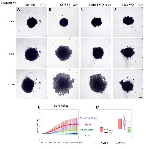 S8 Fig. (Related to Fig 9) Knockdown of Rnd1 or Shirin affect collective properties of mesoderm tissue explants. Analysis of spreading, dispersion, and intercalation of mesodermal explants under various conditions was performed as for experiments presented in Fig 9. (AâD) Control mesoderm, mesoderm treated with Y26862, and mesoderm from embryos injected with Rnd1 MO or Shirin MO. Red arrowheads in A and D indicate areas of large-scale retractions (compare 85 and 170 minutes). Scale bar: 100 μm. (E) Average time course curves with SD for the various experimental conditions. (Eâ) Corresponding relative spreading after 60 minutes and 170 minutes. https://doi.org/10.1371/journal.pbio.3001060.s010 |