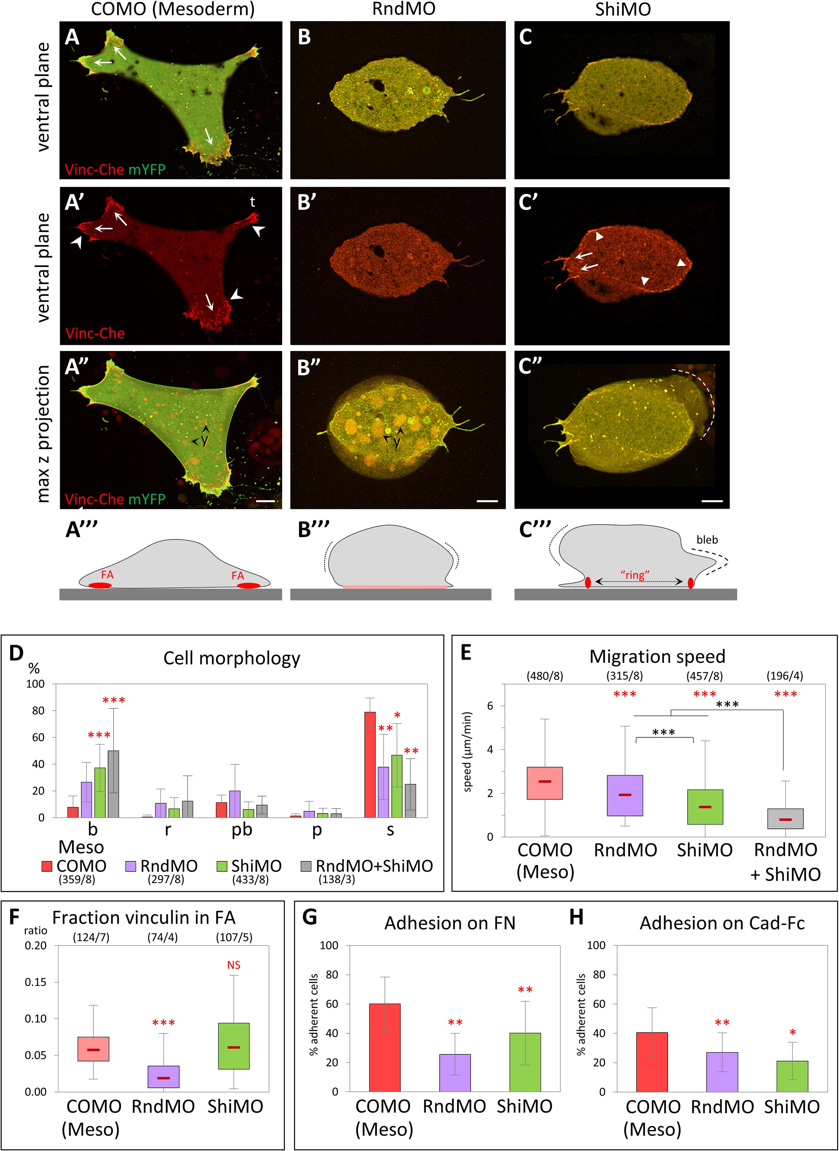 Fig 4. Rnd1 and Shirin are essential for mesoderm spreading and migration. (AâE) Loss-of-function cellular phenotypes. (AâC) Examples of control morpholino (COMO), RndMO, and ShiMO mesoderm cells, expressing Vinc-Che and mYFP, plated on FN. (AâC) Ventral z planes, merged channels; (AââCâ) vinculin alone; (AââCâ) maximal z projections. (AâââCââ) Schematic diagrams summarizing the general cell morphology and adhesive structures. Protrusions are indicated by arrows, FAs by concave arrowheads, vinculin ring by filled arrowheads. Dotted lines highlight the max lateral extension of the cell mass. (A) Control spread mesoderm with large protrusions and numerous FAs. t, tail. (B) Typical RndMO cell displaying a bulging body (Bââ, dotted lines) and a small ventral surface with diffuse vinculin (Bââ, pink line). (C) Example of a bulky ShiMO cell with intermediate adhesive structures, including small FAs at short protrusions (arrows) and ectoderm-like partial ring encompassing most of the ventral surface (arrowheads). A bleb is visible in the max projection (Câ, dashed line). Y, yolk platelets. Scale bars 10 μm. (D) RndMO and ShiMO cells show a significant shift in morphology from spread to round and blebbing cell. Comparison for either of the 2 categories with corresponding COMO (red asterisks), 1-way ANOVA followed by Tukey HSD post hoc test. Refer to S1 Data. (E) Both RndMO and ShiMO inhibit cell migration. Gray asterisks: comparison with double injection RndMO + ShiMO, which significantly enhanced the migration phenotype. One-way ANOVA followed by Tukey HSD post hoc test. Refer to S1 Data. (F) Quantification of vinculin accumulation. Comparison to COMO using pairwise 2-sided Student t test. Refer to S1 Data. RndMO cells have little to no detectable vinculin-rich structures. ShiMO cells show high variability (see main text). (G, H) Inhibition of cell adhesion on FN and on cadherin substrates. Five experiments, a total of 375â740 cells/conditions for FN, >1,000 cells for cadherin. Statistical comparison on the % adherent cells/experiment, pairwise 2-sided Student t test. Refer to S1 Data. ANOVA, analysis of variance; FA, focal adhesion; FN, fibronectin; HSD, honestly significant difference; mYFP, membrane-targeted YFP; Vinc-Che, Vinculin-Cherry. https://doi.org/10.1371/journal.pbio.3001060.g004 |