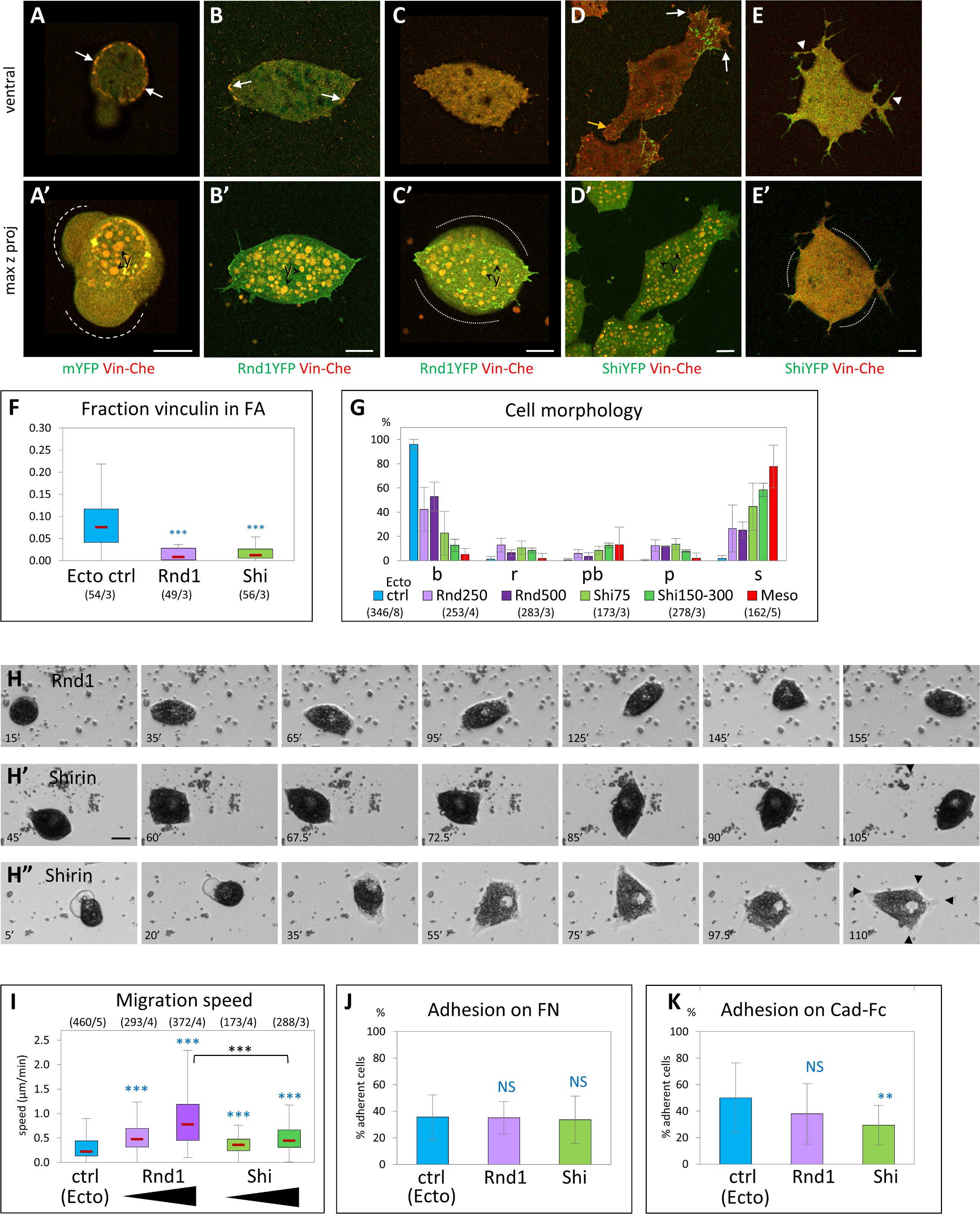 Fig 5. Ectopic expression of Rnd1 or Shirin confers ectoderm with mesoderm-like morphological and migratory properties. (AâG) Effect on cell morphology and vinculin distribution. (AâE) Examples of ectoderm cells co-expressing Vinc-Che and either mYFP (A, control ectoderm), Rnd1-YFP (B, C), or Shirin-YFP (Shi-YFP, D, E). (A) Typical control ectoderm cell, with its distinctive vinculin ring (arrows) and blebs (dashed lines). (B) Rnd1-expressing cells elongate, expand their ventral surface in contact with the substrate, but form only few vinculin-positive FA-like structures (arrows). (C) High Rnd1 expression: The ventral surface is expanded, but lacks vinculin FAs. Cells are bulkier (contours highlighted by dotted lines), although blebs are absent. (D) Shirin-expressing cells spread and form prominent lamellipodia with FAs (white arrows). The yellow arrow points the retracting tail. (E) High Shirin expression: Cells emit long and disorganized protrusions in all directions, but lack detectable FAs, and the cell body tends to round up (dotted lines). Y, yolk platelets. Scale bars: 10 μm. (F) Quantification of vinculin accumulation. Consistent with the loss of the ring and the paucity of FAs, most of vinculin is homogeneously distributed on the ventral surface. Refer to S1 Data. (G) Distribution of morphological subtypes. Both Rnd1 and Shirin cause a strong shift toward spread cells. See S5A Fig for additional morphometric data. Refer to S1 Data. (H, I) Effect on cell migration and adhesion. (H) Frames from time-lapse movies. Examples of Rnd1- and Shirin-expressing ectoderm cells spreading and migrating. The cell in Hâ spreads extensively, ending with multiple protrusions (black arrowheads) and low motility. Scale bar: 20 μm. (I) Quantification of cell migration, as in Fig 2. Different levels of Rnd1 and Shirin expression were tested (250 and 500 pg mRNA for Rnd1, 75 and 150â300 pg for Shirin). Rnd1-expressing cells show higher migration than wild-type or Shi-expressing cells. Statistical comparisons: 1-way ANOVA followed by Tukey HSD post hoc test. Refer to S1 Data. (J, K) Quantification of cell adhesion on FN and on cadherin. Four to 5 experiments, >1,000 cells per condition. Statistical comparison on the % adherent cells/experiment, pairwise 1-sided Student t test. Refer to S1 Data. ANOVA, analysis of variance; FA, focal adhesion; FN, fibronectin; HSD, honestly significant difference; mYFP, membrane-targeted YFP; Vinc-Che, Vinculin-Cherry. https://doi.org/10.1371/journal.pbio.3001060.g005 |