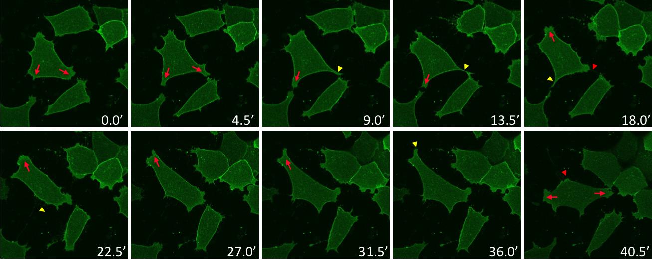 S1 Fig. (Related to Fig 1) (A) Mode of mesoderm locomotion. Consecutive frames from time lapse of mYFP labeled mesoderm cells migrating on FN. The behavior of the central cell is highlighted: The cell emits 1 or multiple protrusions (red arrows). One of the protrusions becomes a tail (yellow arrowhead) as the cell stretches toward another direction, and eventually retracts (red arrowheads). |