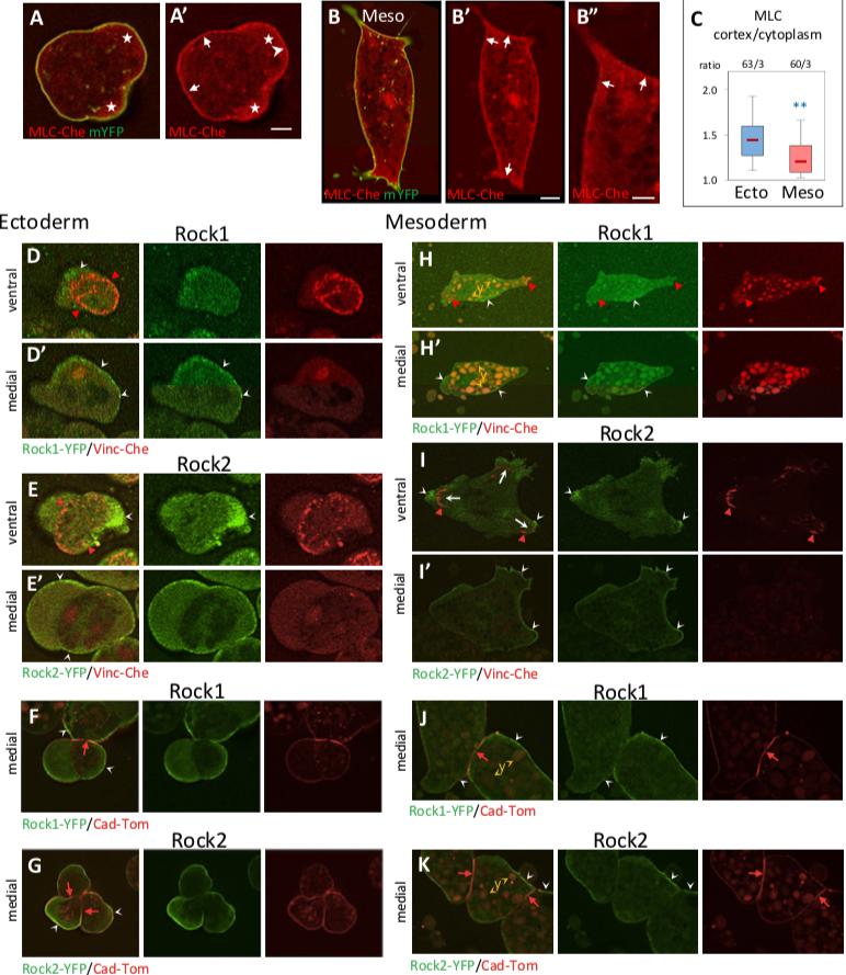 S2 Fig. Localization of MLC and Rock (related to Fig 2). (AâC) Differential MLC accumulation at the cell cortex. Ectoderm and mesoderm cells expressing MLC-Cherry (MLC-Che) and mYFP. (A) Ectoderm cells show strong accumulation around the cell body (arrows) and part of the blebs (arrowhead). (B) Mesoderm cells show irregular cortical MLC, mostly at the concave regions near or between protrusion. (C) Quantification of cortical MLC, expressed as the ratio of cortical /cytoplasmic fluorescence intensities. Blebs and protrusions were excluded from the measurements. Statistical comparison using 2-sided Student t test. Refer to S1 Data. Scale bars: Aâ 5 μm, Bâ 10 μm, Bâ 5 μm. (DâK) Subcellular localization of Rock1-YFP and Rock2-YFP in ectoderm and mesoderm cells. Selected single planes from live confocal microscopy, either near the glass (ventral) or about 5â10 μm above (medial). Concave white arrowheads point at examples of Rock1/2 accumulation. (D, E, H, I) Localization relative to the cell cortex and to Vinculin-Cherry labeled cell-matrix adhesive structures (red arrowheads). (F, G, J, K) Localization relative to cellâcell contacts, marked by cadherin-dTomato (red arrows). (D, E) In the ectoderm, Rock1 and 2 have both a cortical localization. Levels are low on the ventral side inside the adhesive ring, but stronger outside of the ring, particularly for Rock2. (F, G) Levels are very low at cellâcell contacts. (H, I) In the ventral face of mesoderm cells, Rock1 tend to be enriched in the central part, Rock2 at the periphery of the protrusions. Both are low at FAs. They both accumulate at the cortex along cell free edges (medial planes). (J, K) Levels are low at cellâcell contacts. Y: autofluorescence of yolk platelets, abundant in mesoderm cells. FA, focal adhesion; MLC, myosin light chain; mYFP, membrane-targeted YFP; Rock, Rho-kinases. https://doi.org/10.1371/journal.pbio.3001060.s004 |