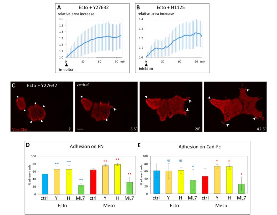 S3 Fig. (Related to Fig 2) (A, B) Area expansion for single cells after treatment with Rock inhibitors Y27632 (50 μM) and H1125 (1 μM). Average and SD of 107 cells (A) and 34 cells (B). (C) Changes in vinculin distribution. Images from a time-lapse movie of a small group of 3 cells expressing Vinculin-Cherry, treated at time = 0 with Y27632. Filled arrowheads: ring-like adhesion; concave arrowheads: FAs. Scale bars: 10 μm. (D, E) Opposite effects of Rock and MLCK inhibition on cell adhesion. Ectoderm and mesoderm adhesion to FN or cadherin was measured after treatment with Rock inhibitors Y27632 (Y, 50 μM), H1125 (H, 1 μM), or the MLCK inhibitor ML7. Five experiments, a total of 1,000â2,000 cells/conditions. Statistical comparison to control ectoderm or mesoderm, comparing the % adherent cells/experiment, pairwise 2-sided Student t test. Refer to S1 Data. FA, focal adhesion; FN, fibronectin; SD, standard deviation. https://doi.org/10.1371/journal.pbio.3001060.s005 |