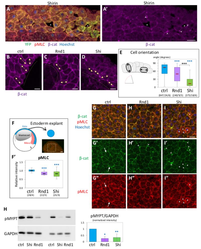 S6 Fig. (Related to Fig 6) Effect of Rnd1 and Shirin ectopic expression. (A) Loosening of ectoderm tissue upon expression of Shirin. Immunostained section of a YFP-Shirin expressing embryo showing a loosely organized ectoderm, characterized by the presence of large intercellular spaces (asterisks) and heterogenous β-catenin signal, weak signal along membranes except for strong local concentrations (arrowheads). Scale bar, 10 μm. (BâE) Cell orientation. (BâD) The main axis of deep ectoderm cells (double arrows) tend to orient roughly perpendicular to the inner surface of the tissue (dashed line). Rnd1-expressing cells show variable orientation. Shirin-expressing cells align parallel to the surface. Scale bars, 10 μm. (E) Quantification of the angle between the cell axis and the tissue interface. Numbers into brackets correspond to number of cells/embryos/experiments. Refer to S1 Data. (FâI) Analysis of β-catenin (green) and pMLC (red) in ectoderm explants. (F) Diagram, section of a control ectoderm explant (scale bar, 50 μm) and quantification. Statistical comparison using 1-way ANOVA followed by Tukey HSD post hoc test. (GâI) Examples of ectoderm explants. (G) β-catenin and pMLC signal along cell edges is highest in control (arrows). H,I) Explants expressing Rnd1 or Shirin. β-catenin tends to accumulate at cell vertices (concave arrowheads). pMLC levels are lower except for some cells (I, asterisks) that have rounded up and display high pMLC throughout the cell. Little to no β-catenin is seen between the round cells. Scale bars, 20 μm. (H) Effect of Rnd1 and Shirin expression on phosphorylation of MYPT. Dissected ectoderm tissues were analyzed by western blot. GAPDH was used as loading control, and the pMYPT signal was expressed as relative ratio, normalized to ectoderm control set to 1.0. Three independent experiments, statistical analysis using 1 sample, 2-sided t test. Refer to S1 Data. ANOVA, analysis of variance; HSD, honestly significant difference; MYPT, myosin light chain phosphatase; pMLC, phosphorylated MLC. https://doi.org/10.1371/journal.pbio.3001060.s008 |