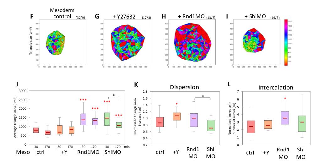 S8 Fig. (Related to Fig 9) Knockdown of Rnd1 or Shirin affect collective properties of mesoderm tissue explants. (continued) Analysis of spreading, dispersion, and intercalation of mesodermal explants under various conditions was performed as for experiments presented in Fig 9. (FâK) Delaunay triangulation of nuclei in order to measure cell dispersion. (FâI) Representative plots of triangulated nuclei after 170 minutes of imaging. X and Y labels mark the coordinates in μm, and the color-coded scale bar indicates the area of the triangles in μm2. (J) Quantification of average triangle size at the initiation of spreading (30 minutes) and the end of the time lapse. (K) Quantification of the relative change in triangle size over time calculated by dividing the average triangle area at 170 minutes by that at 30 minutes. (L) Quantification of intercalation calculated by dividing number of nuclei at the ventral surface at 170 minutes by the number at 30 minutes. Statistical comparisons: 1-way ANOVA followed by Tukey HSD post hoc test. Refer to S1 Data. ANOVA, analysis of variance; HSD, honestly significant difference; SD, standard deviation. https://doi.org/10.1371/journal.pbio.3001060.s010 |