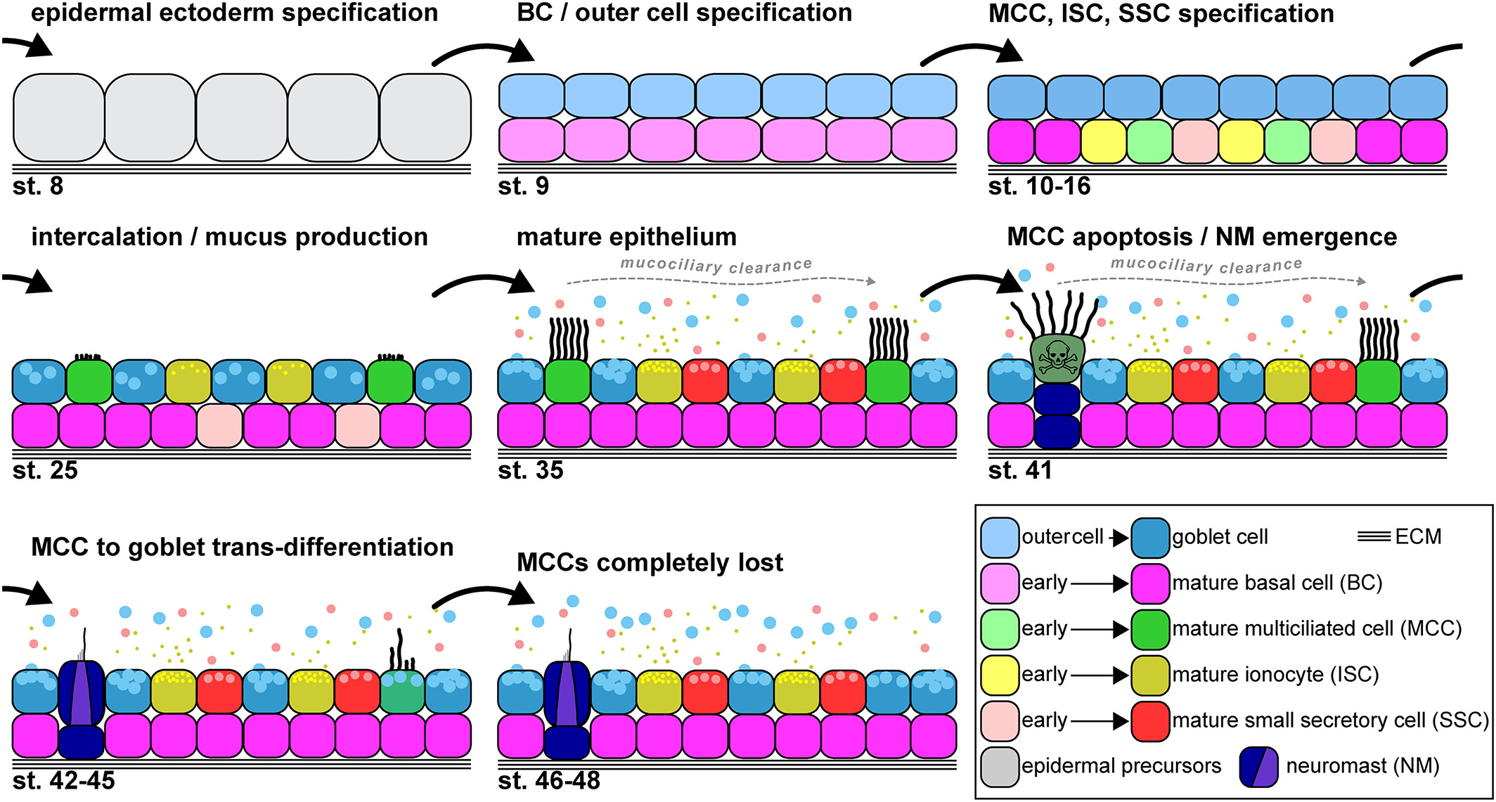 Development, function and remodeling of the Xenopus mucociliary epidermis. Schematic representation of key processes in life of the Xenopus embryonic mucociliary epidermis, from its specification to remodeling and loss of multiciliated cells. st., developmental stage; ECM, extracellular matrix; cell types are colorâcoded, and a legend is given in the lowerâright corner of the figure. Please see text for details.