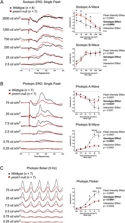 Fig. 3. Averaged scotopic single-flash recordings, photopic single-flash recordings and photopic 5 Hz flicker recordings from wild-type and prom1-null F0 animals. (A) Averaged scotopic single-flash recordings from wild-type (n=8) and prom1-null animals (n=7). (B) Averaged photopic single-flash recordings from wild-type (n=7) and prom1-null animals (n=7). (C) Averaged photopic 5 Hz flicker recordings from wild-type (n=7) and prom1-null animals (n=7). Waterfall plots (left) and transformed linear regression curves (right) were used to visualize and compare wild-type and prom1-null ERG waveforms and A- and B-wave amplitudes. Data are plotted as mean±s.e.m. From one replicate. *P<0.05, ***P<0.001, ****P<0.0001 (two-way ANOVA with Sidak's post hoc test). |