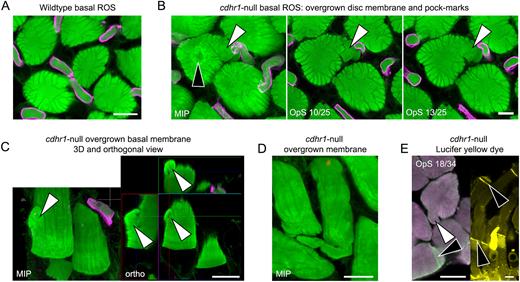 Fig. 4. Rod outer segment morphology in wild-type and F3 cdhr1-null X. laevis. (A) Wild-type (n=6) basal ROS have clear incisures and a uniform appearance all around the ROS. (B) A maximum intensity projection (left) and two optical sections (middle, right) demonstrating the structure of an overgrown membrane as seen in a coronal section of cdhr1-null basal ROS (F3, n=9). Features of interest were the overgrown membrane (white arrowheads) and the holes (‘pock-marking’) at the base of the OS looking up from the inner segment (black arrowhead). (C) A side-view of overgrown disc membranes which appeared to comprise a large overgrowth that folds back onto itself (white arrowhead). (D) A long ‘tail’ of overgrown disc membrane that extended from, and then looped under, the basal ROS. Green, WGA; magenta, cone opsin. (E) Lucifer Yellow staining of cdhr1-null ROS in the coronal (left) and sagittal (right) orientations; nascent discs at the basal ROS are normally open to the extracellular space as are discs near the tip of the ROS (black arrowheads), but there was no abnormal Lucifer Yellow dye penetration into the middle of the cdhr1-null ROS (n=7; white arrowhead, overgrown membrane). From two replicates. Green and yellow, Lucifer Yellow; magenta, WGA. Scale bars: 5 µm. |