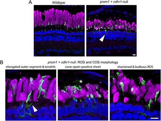 Fig. 6. Rod outer segment and cone outer segment morphology in wild-typeand F0 prom1 plus cdhr1 double-null X. laevis. Similar to prom1-null animals, ROS were shortened and bulbous and COS were elongated and fragmented. There were occasional instances of mislocalization of cone opsin to the inner segment and tendrils of cone opsin-positive membrane (white arrowheads), and sheets of cone opsin-positive membrane (asterisk) that were closely associated with the ROS (WT, n=15; F0, n=12). From three replicates. Green, cone opsin; magenta, WGA; blue, Hoechst. Scale bars: 10 µm. |